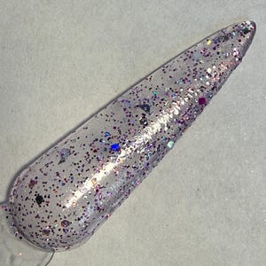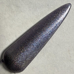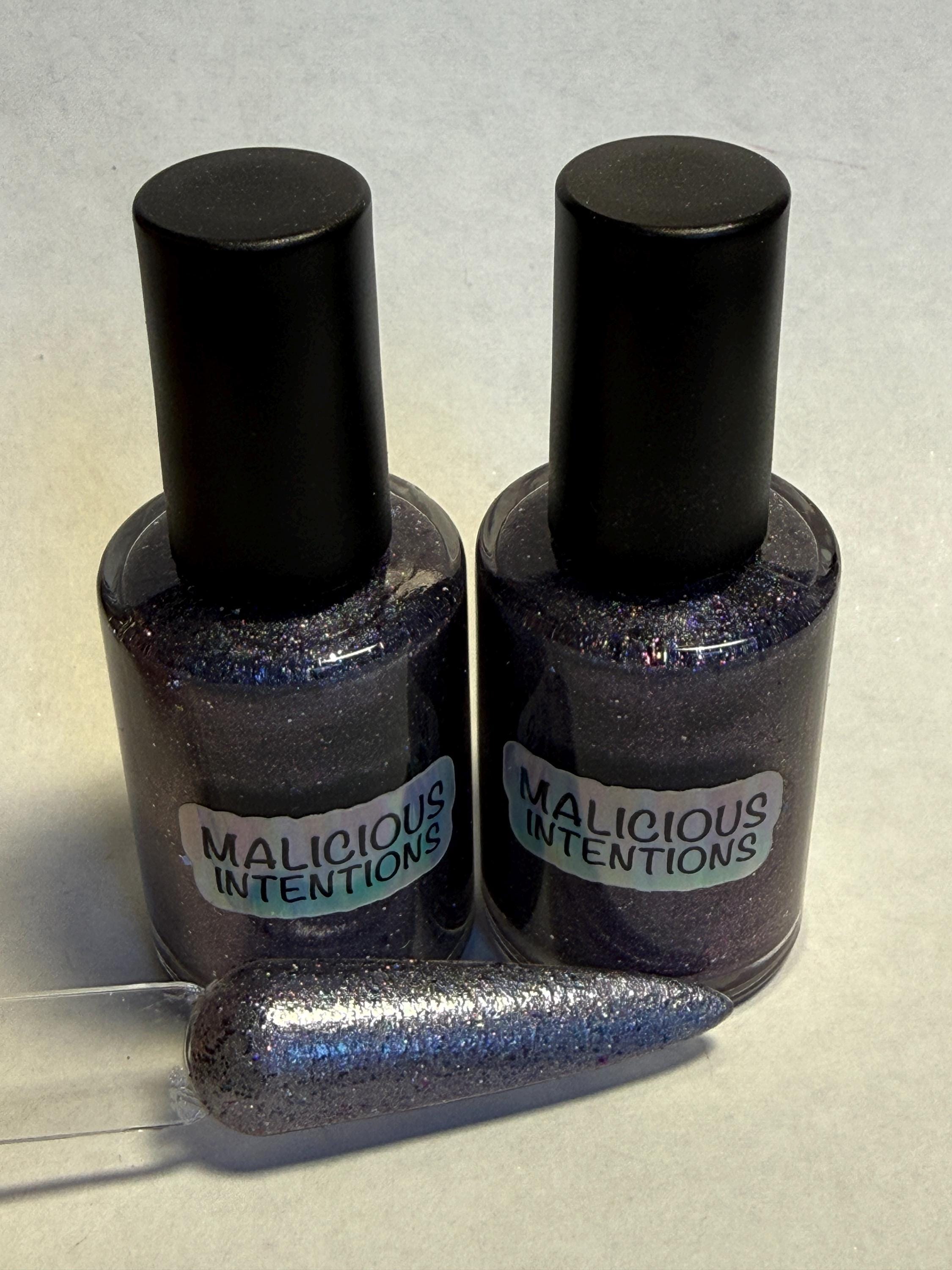This nail polish comes in either 5 or 15ml bottles and is a silver/purple duochrome with fine holo glitter. This was made with magnetic pigments but I don't like how the magnetic effect turned out, so I'm selling it as a regular polish.