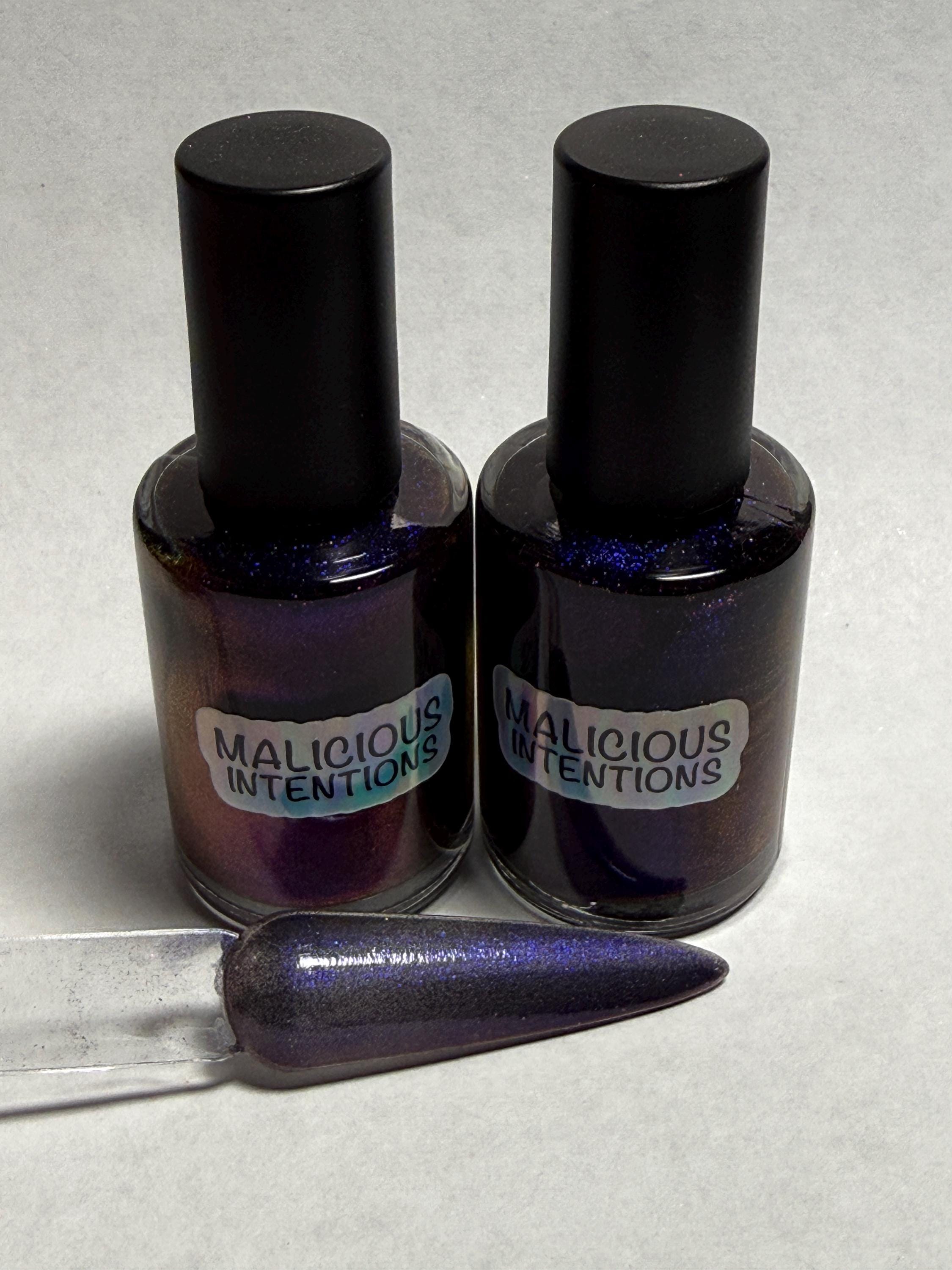 This nail polish comes in either 5 or 15ml bottles and is a blackened purple chameleon.