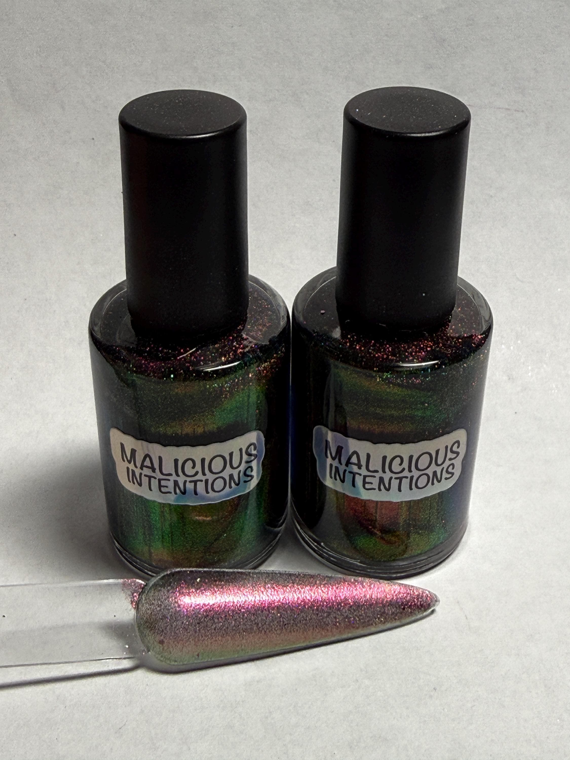 This nail polish comes in either 5 or 15ml bottles and is a chameleon that flashes mostly pink and green but also has gold and orange tones as well.