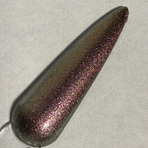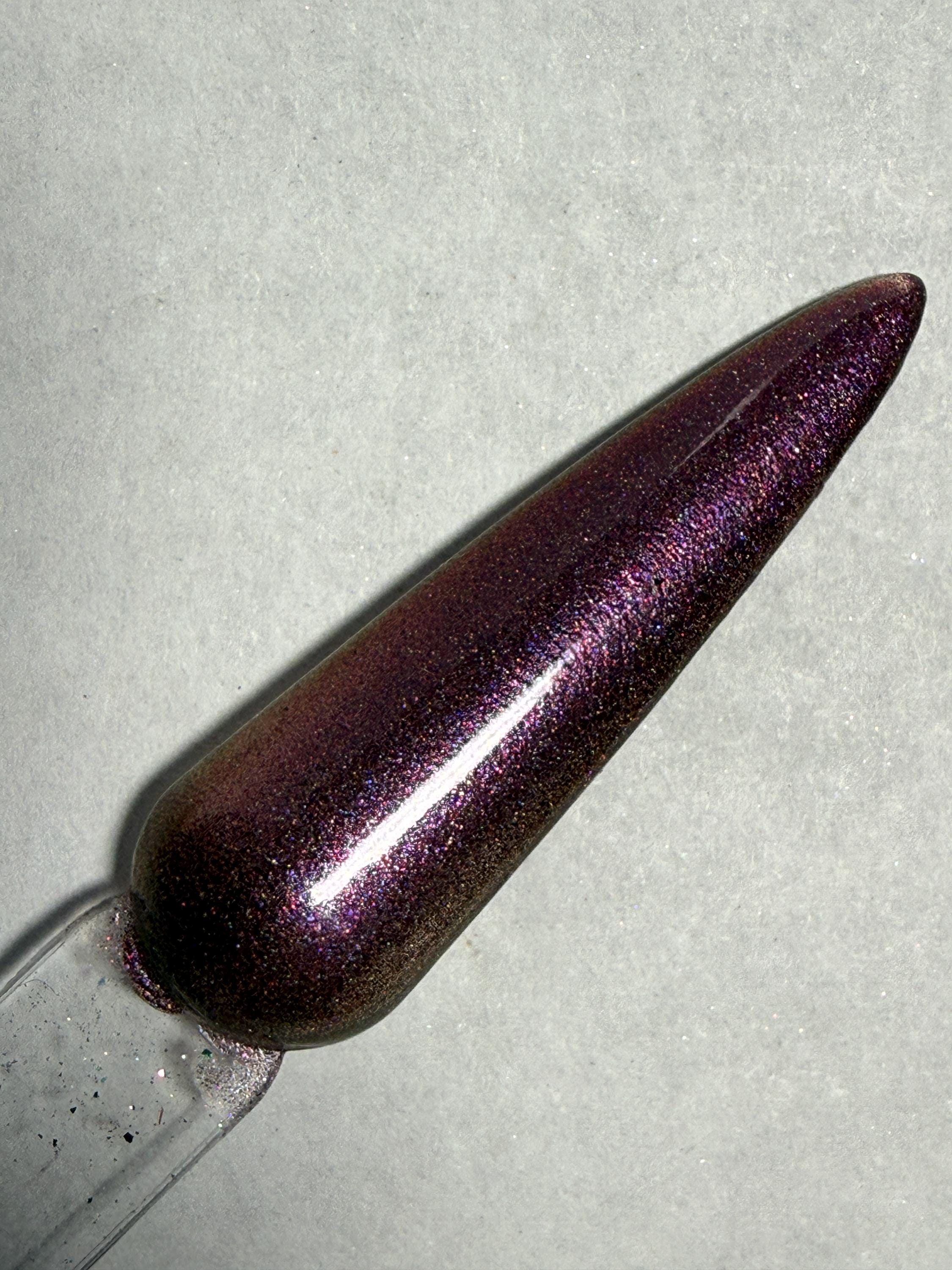 This nail polish comes in either 5 or 15ml bottles and is a dark pink/orange chameleon with ultra fine silver holo mixed in.