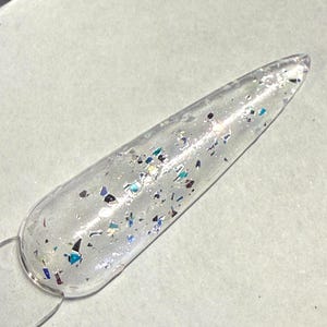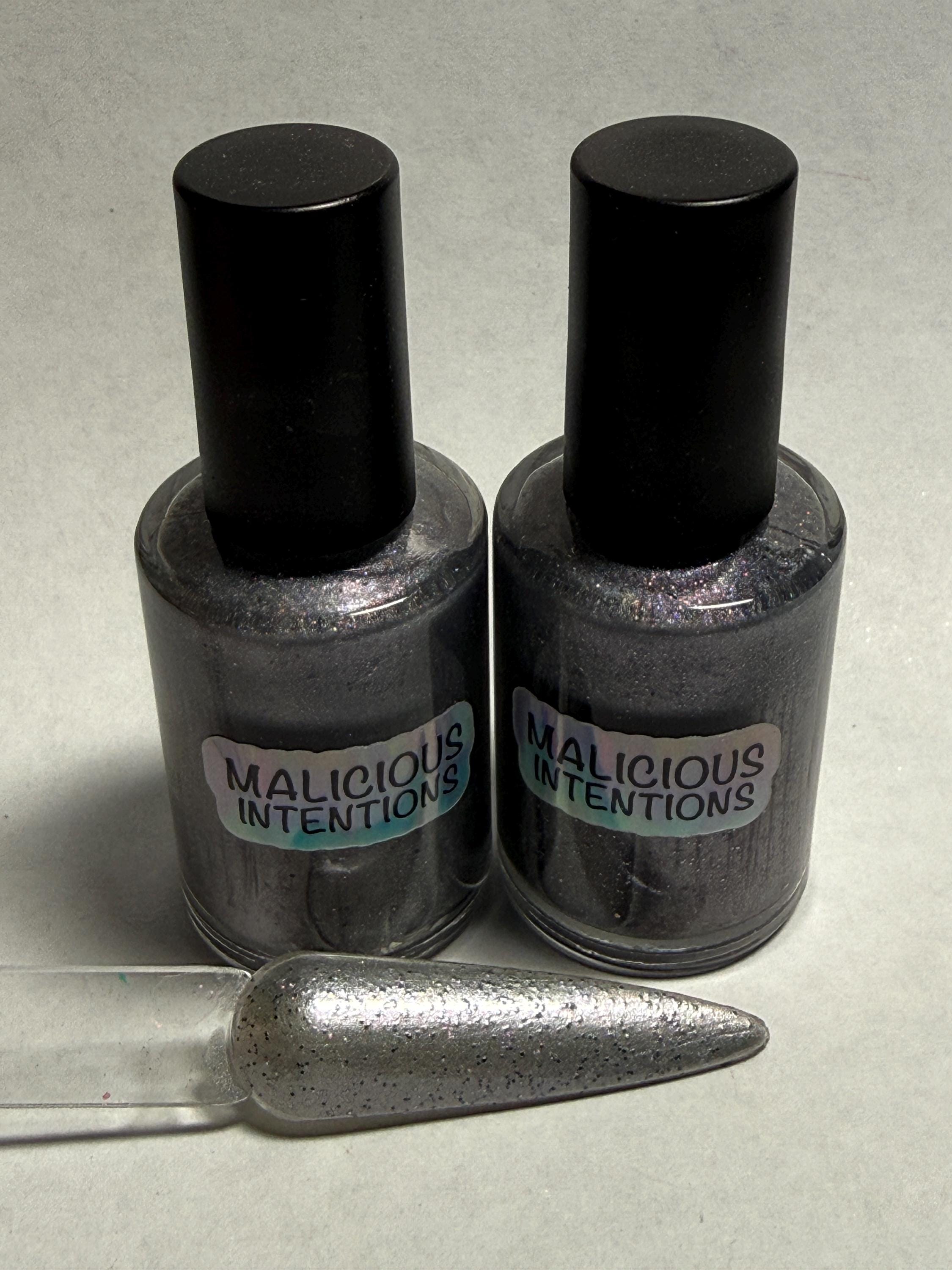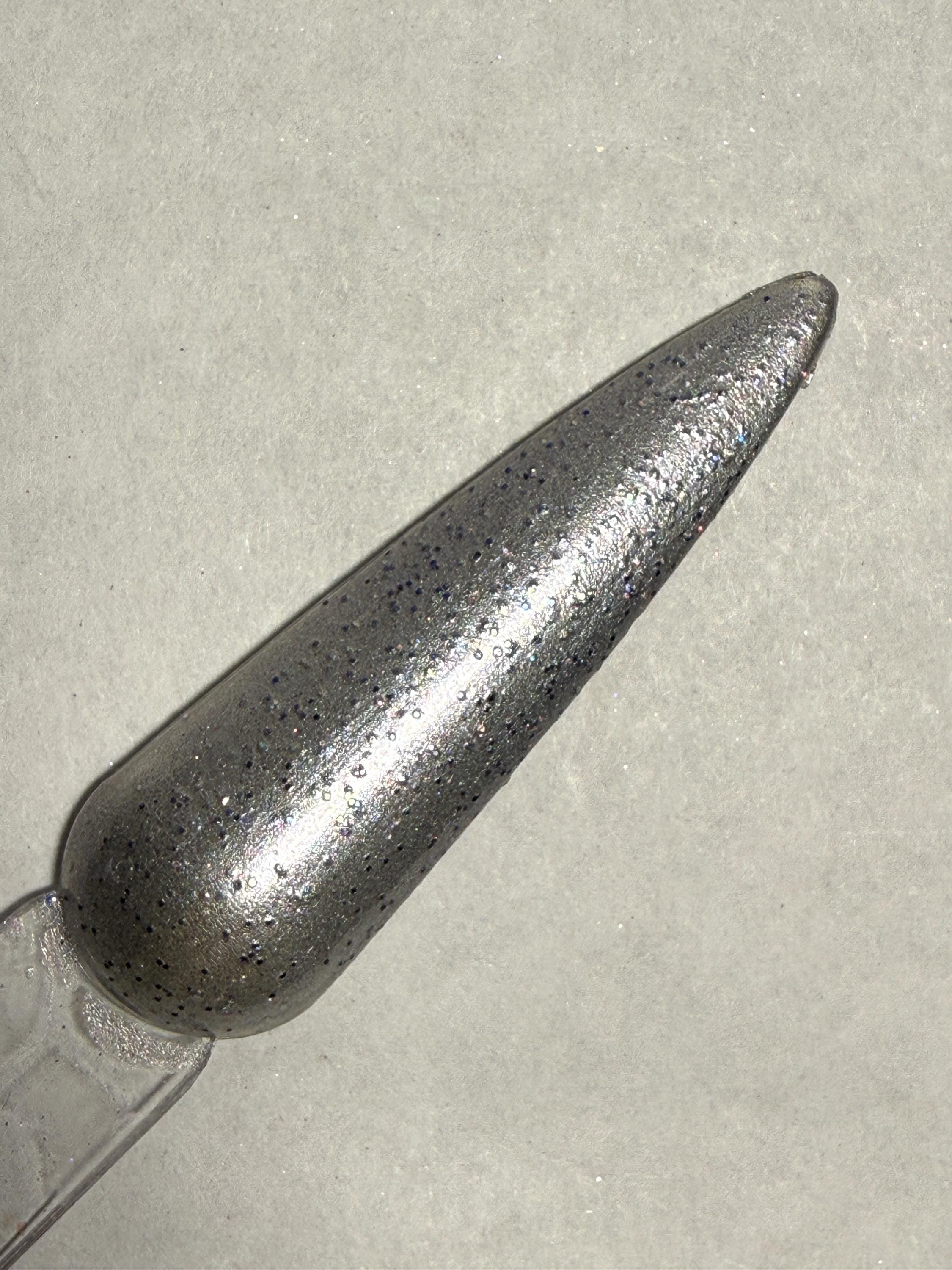 This nail polish comes in either 5 or 15ml bottles and is a shimmery silver with fine black and silver holo glitter mixed in.