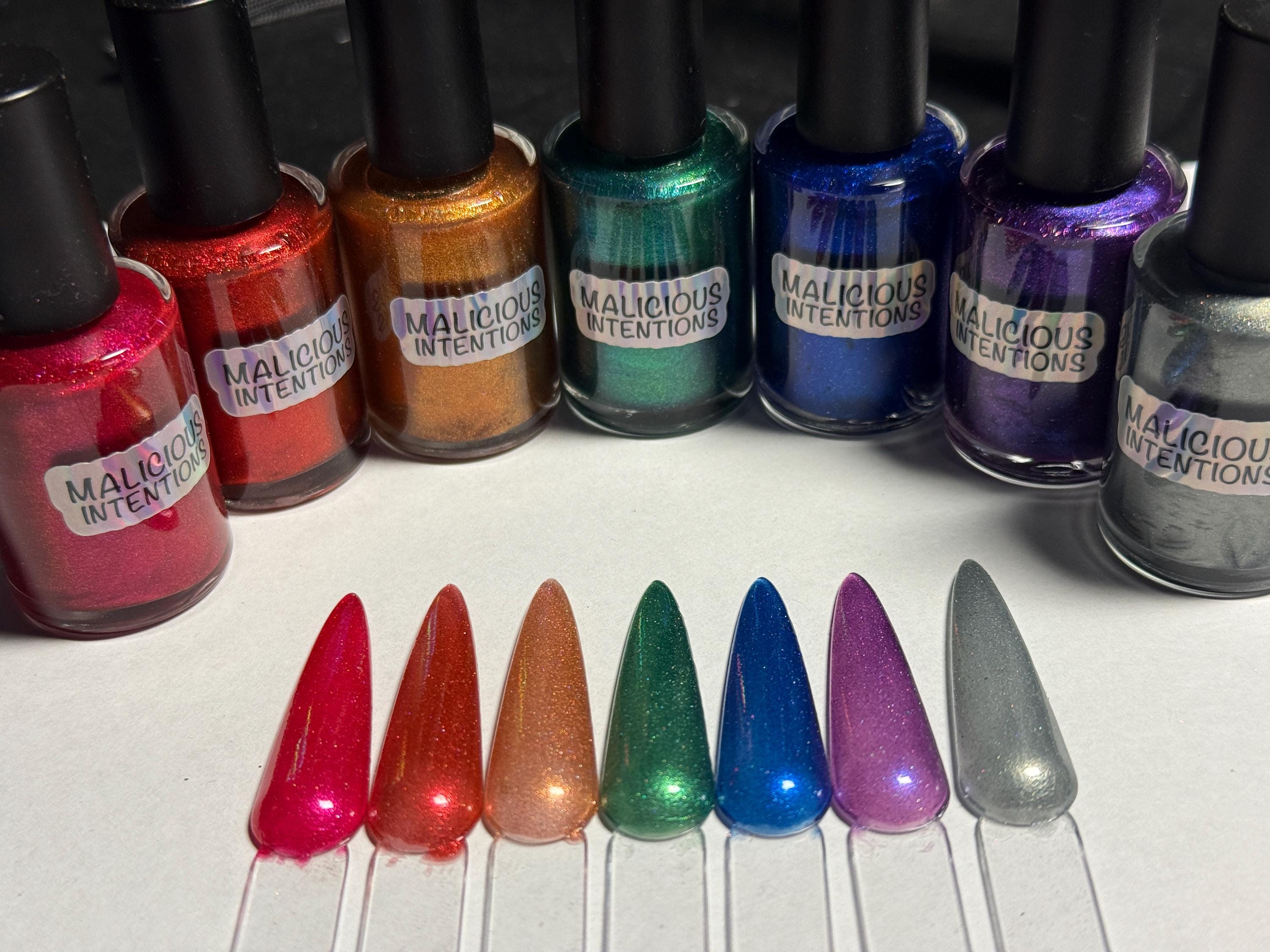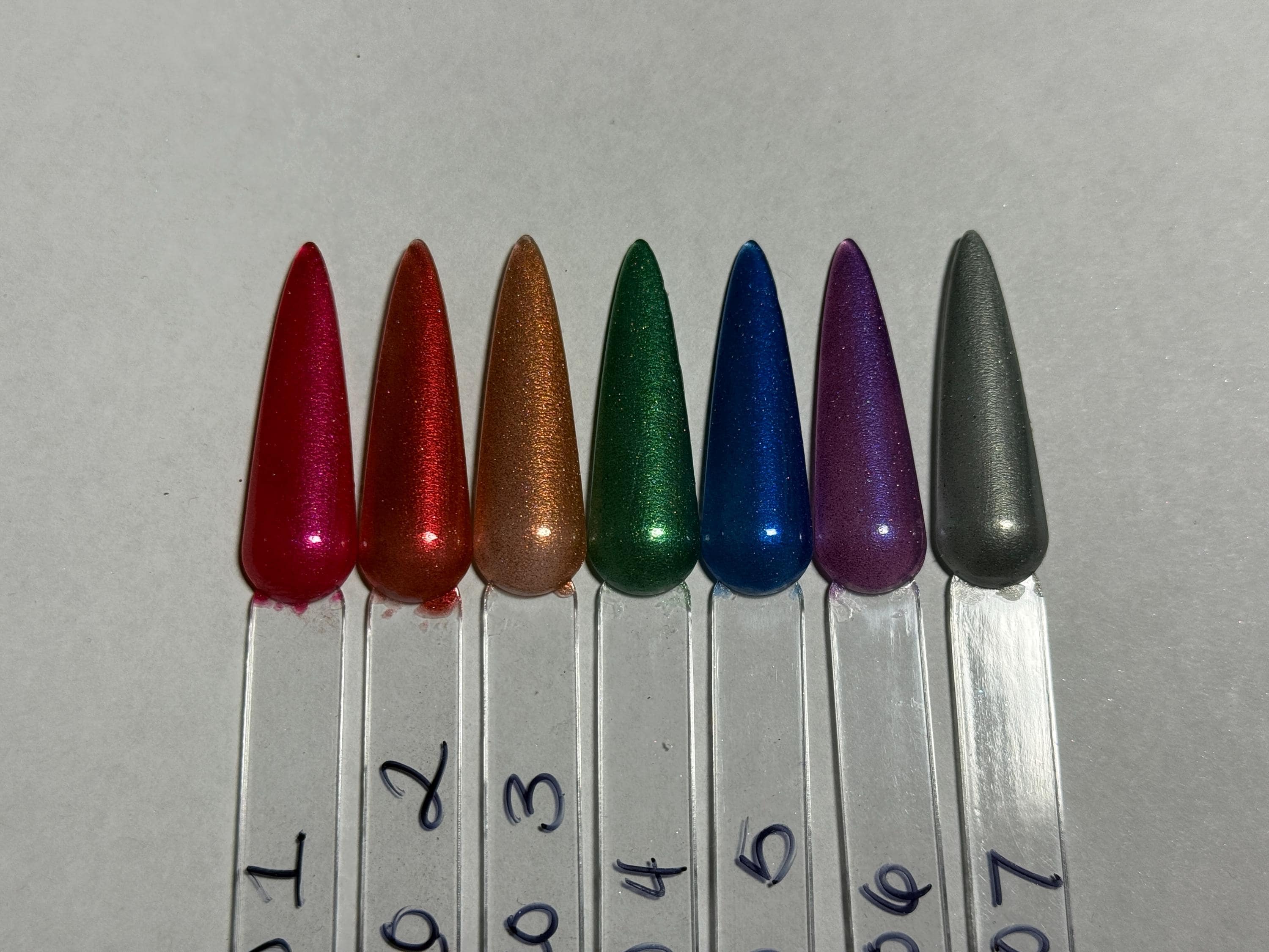The Chamholo Series is a group of 7 polishes with a shifty chameleon base that flashes the surrounding colors of the spectrum (the gray flashes blue and silver) with a bit of ultra fine holo mixed in to give it a bit of sparkle.