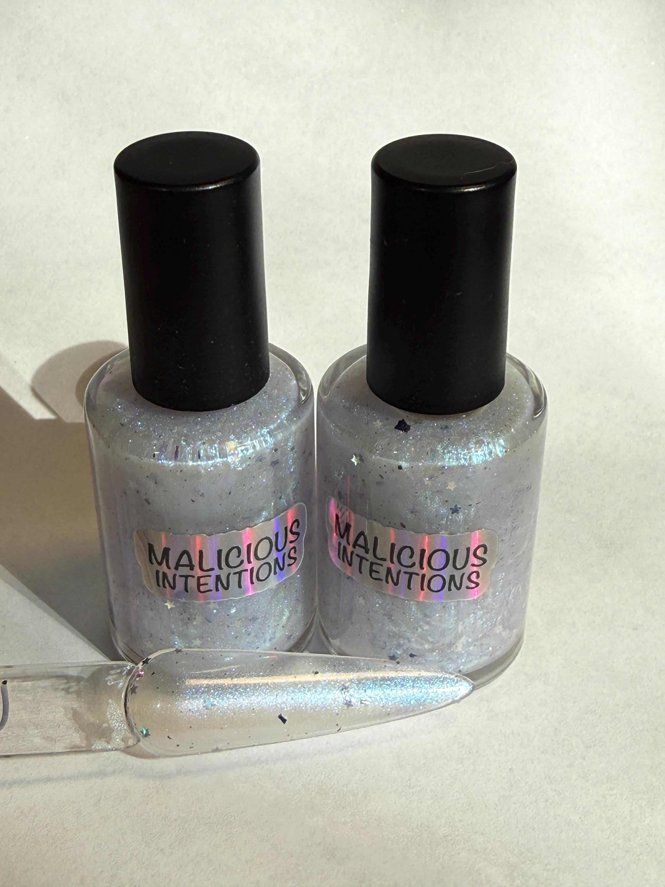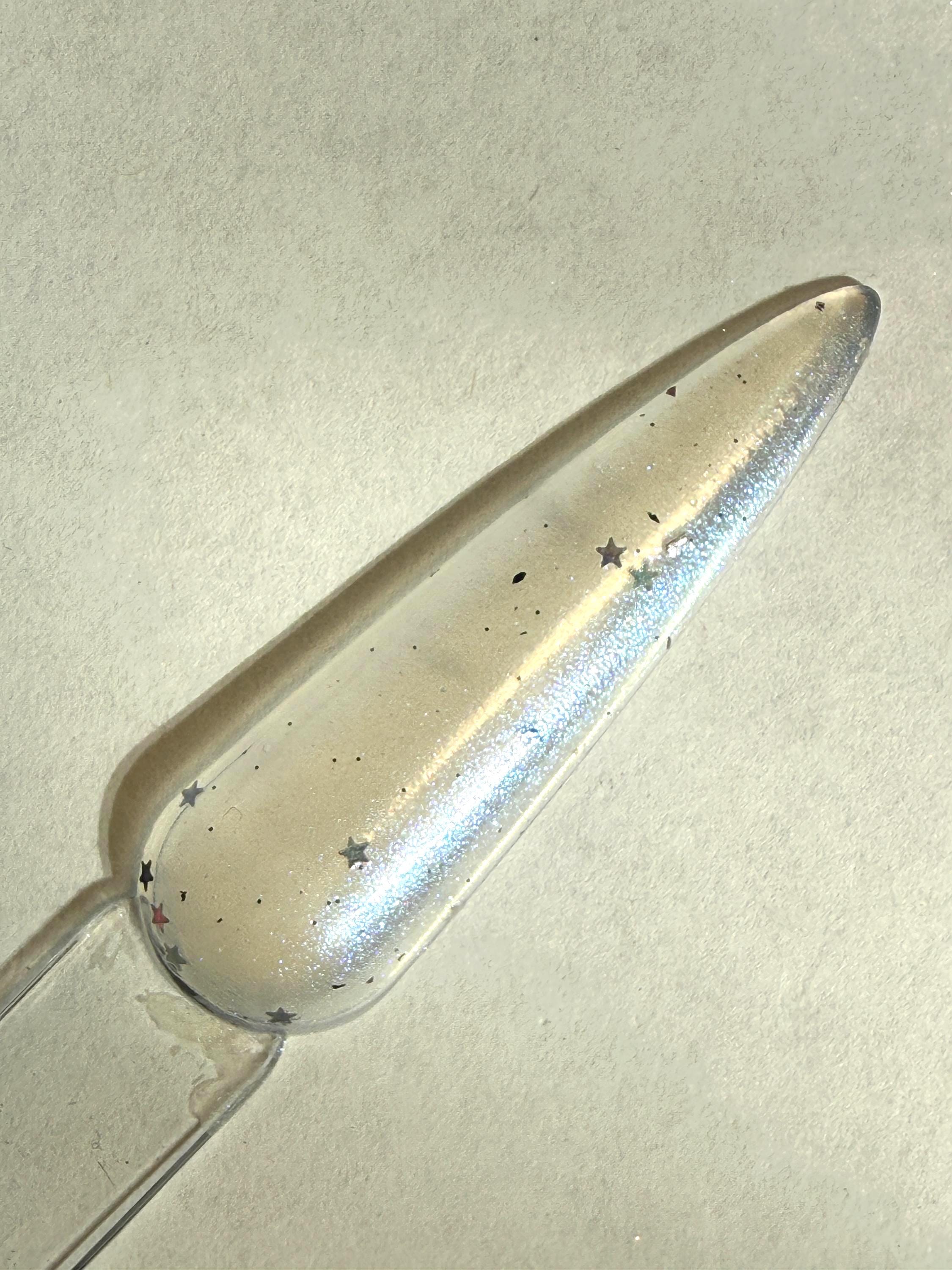 This nail polish comes in either 5 or 15ml bottles and is a white shimmer that flashes purple with 1mm holo stars and a few black flakes.