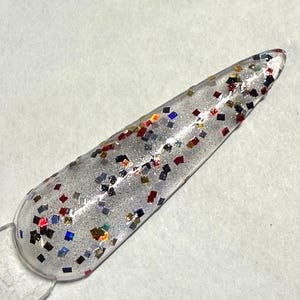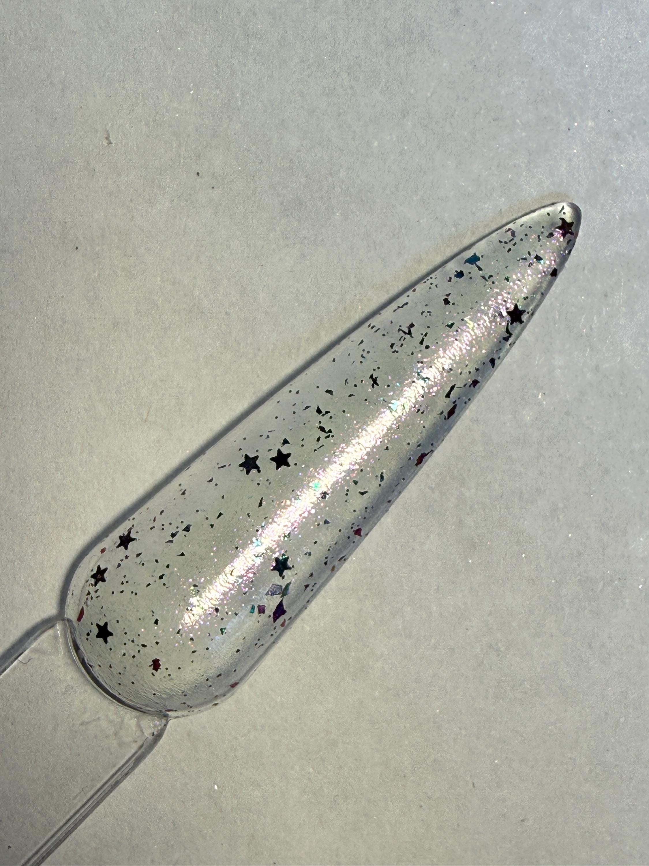 This nail polish comes in either 5 or 15ml bottles and is a white shimmery base that shifts pink with black and silver 1mm holo stars and flakes.