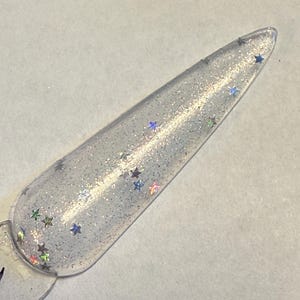 This nail polish comes in either 5 or 15ml bottles and has a ton of silver holo flakes on a duochrome base that shifts green.