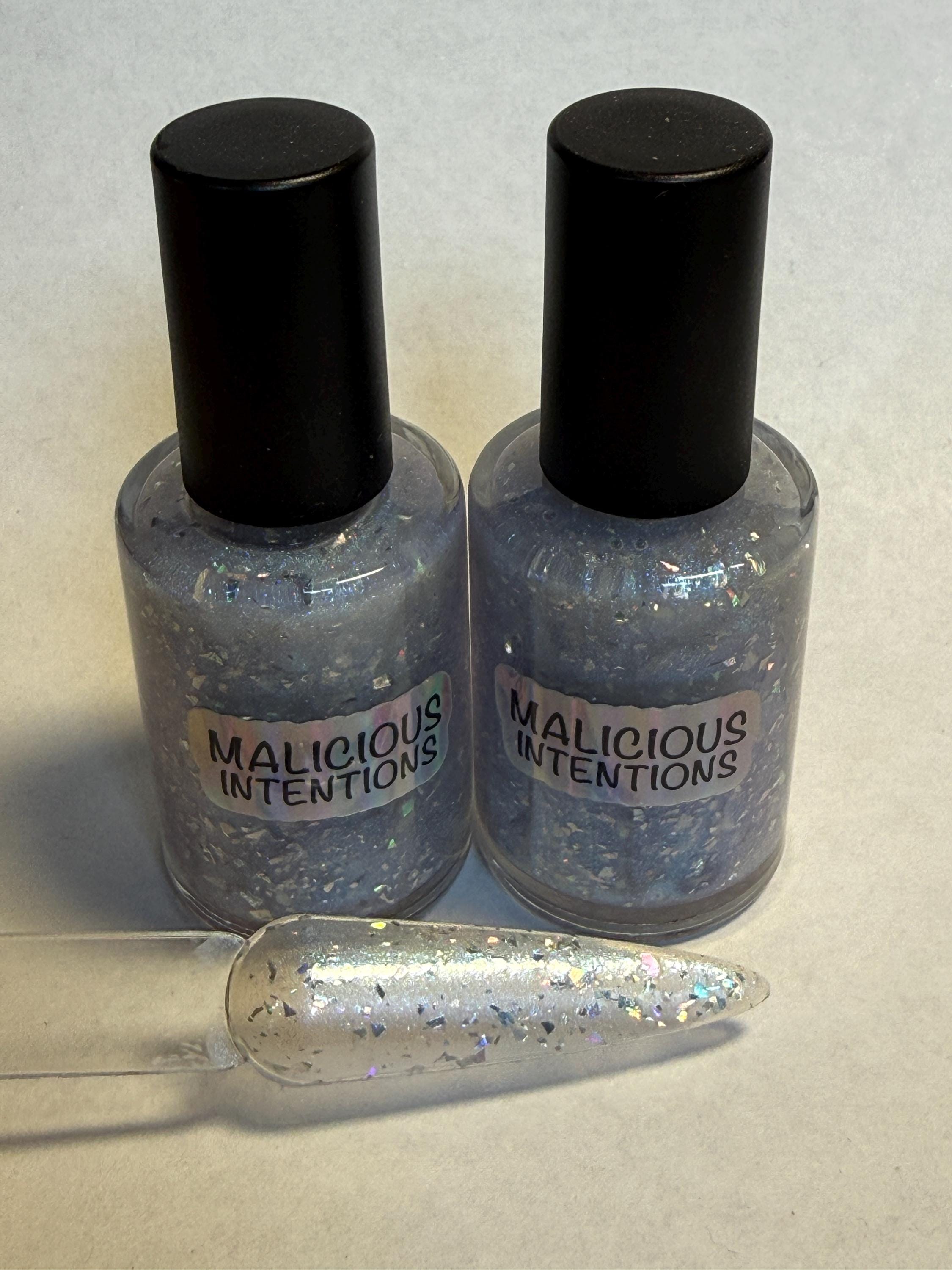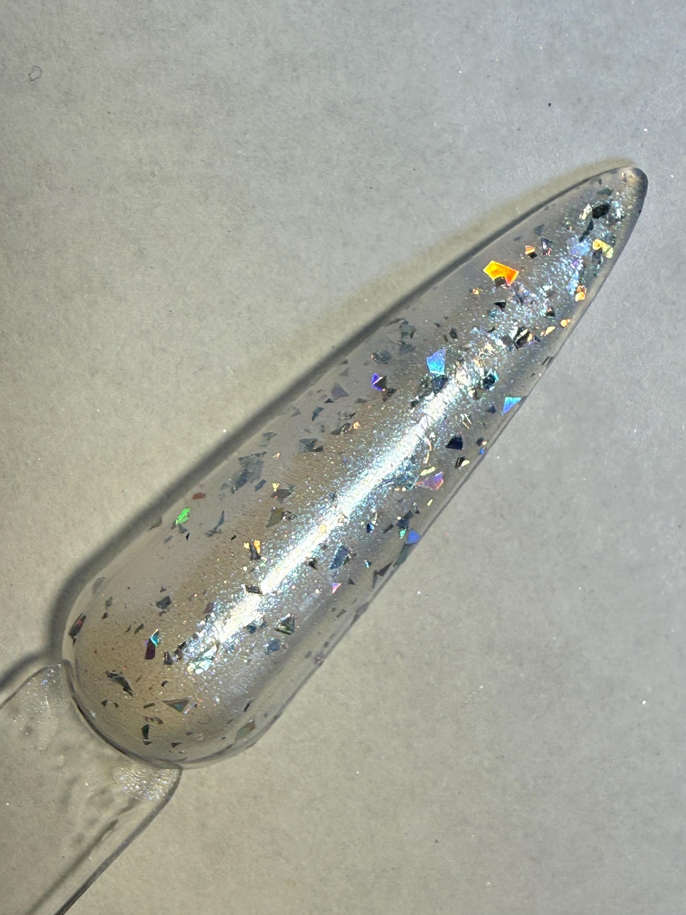 This nail polish comes in either 5 or 15ml bottles and has a white duochrome base that flashes blue with silver holo flakes.