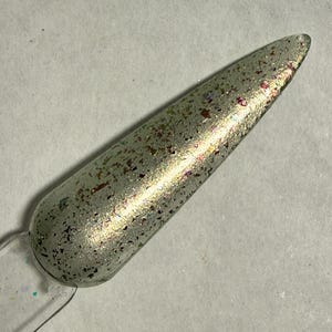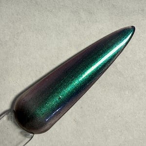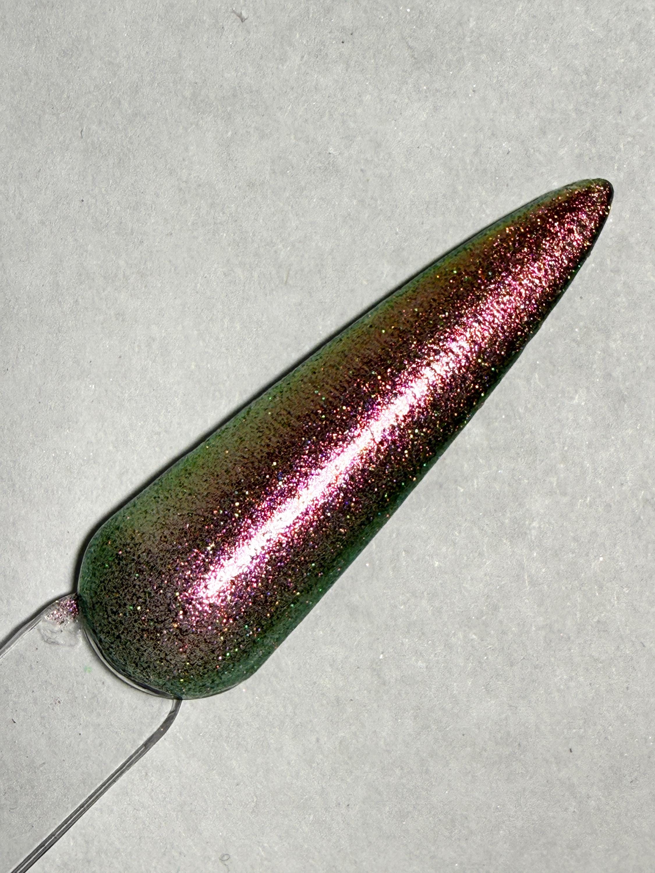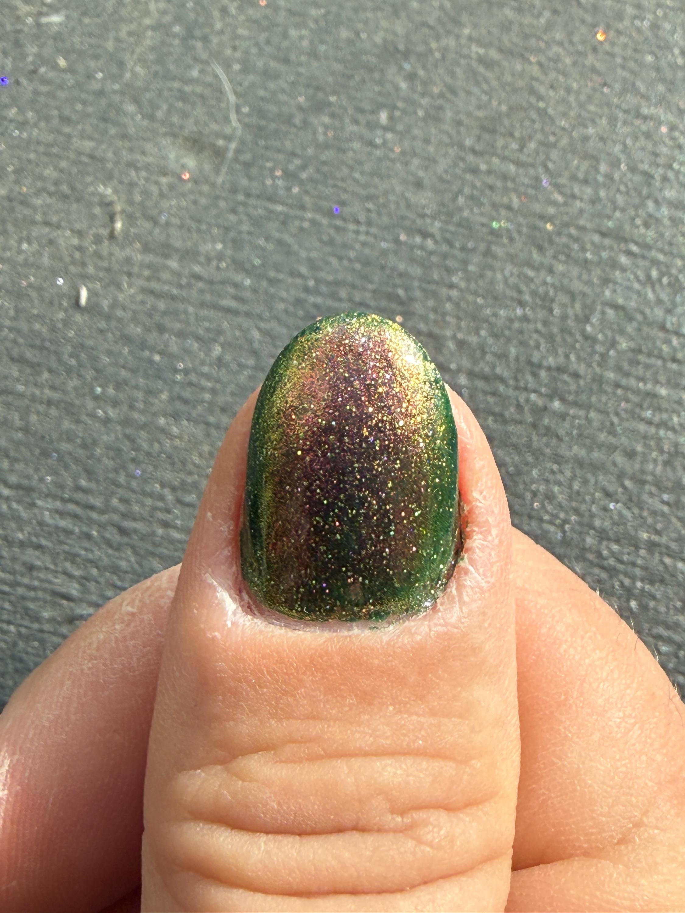 This nail polish comes in either 5 or 15ml bottles and is a green chameleon that flashes pink, orange, and gold with a bit of green holographic glitter.