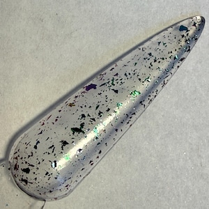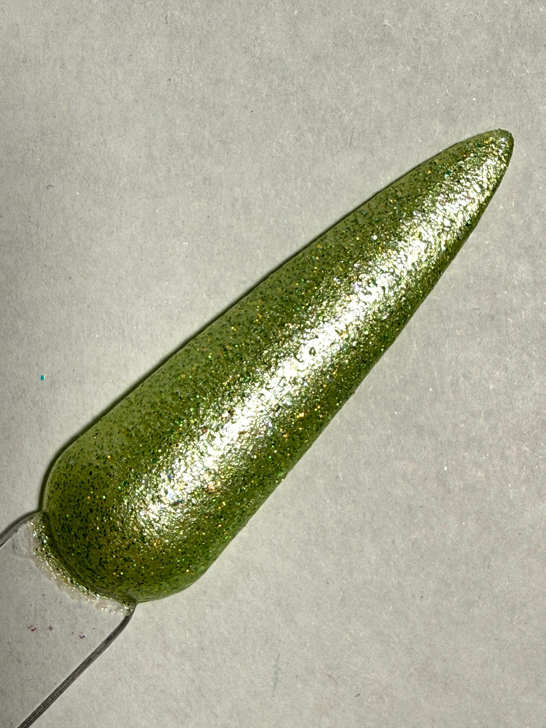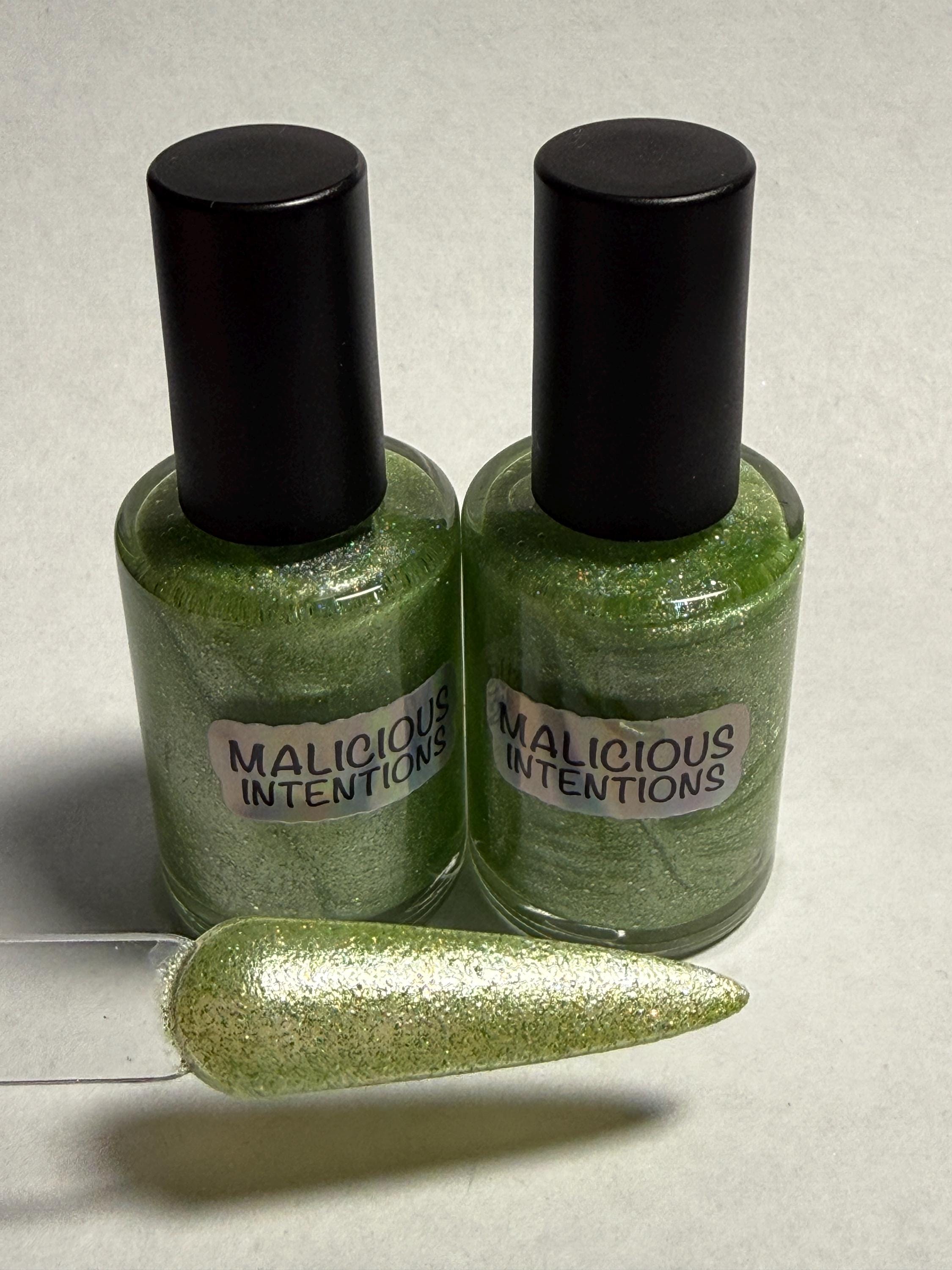 This nail polish comes in either 5 or 15ml bottles and is a light lime green shimmer with a touch of green holo glitter.
