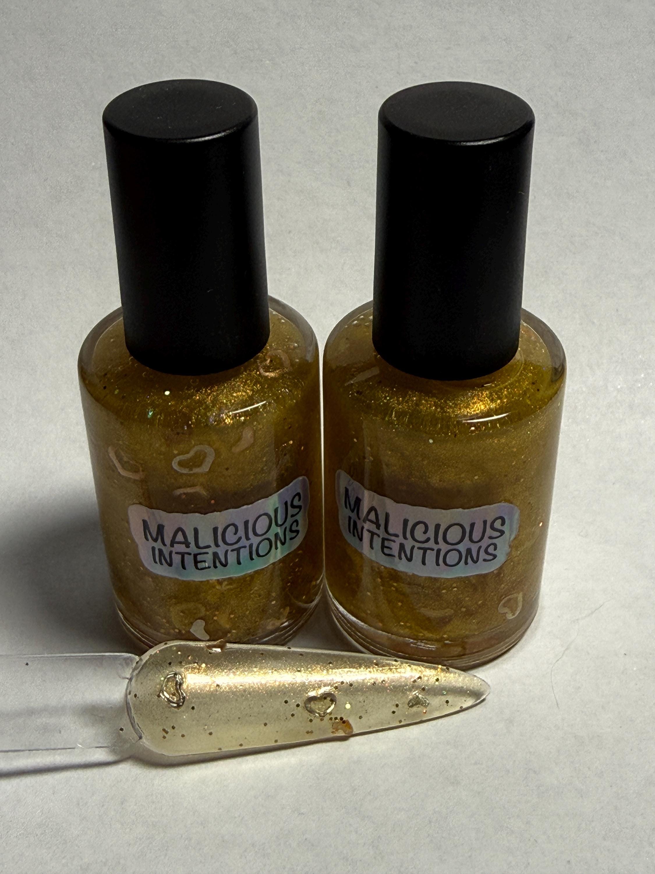 This nail polish comes in either 5 or 15ml bottles and is a gold shimmer with gold holo glitter and silver/gold holo hearts.