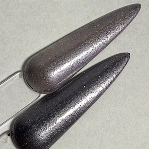 The photos/videos is one coat over a black base and magnetized using the bead method, and the other is two coats on clear, velvetized.