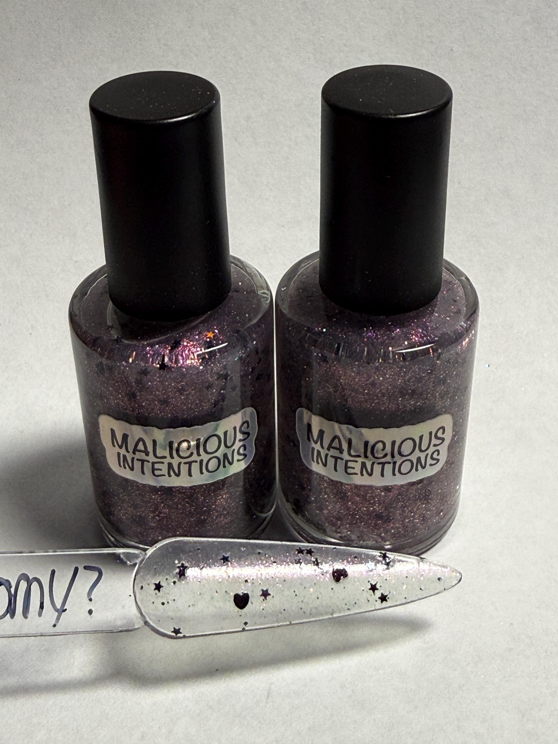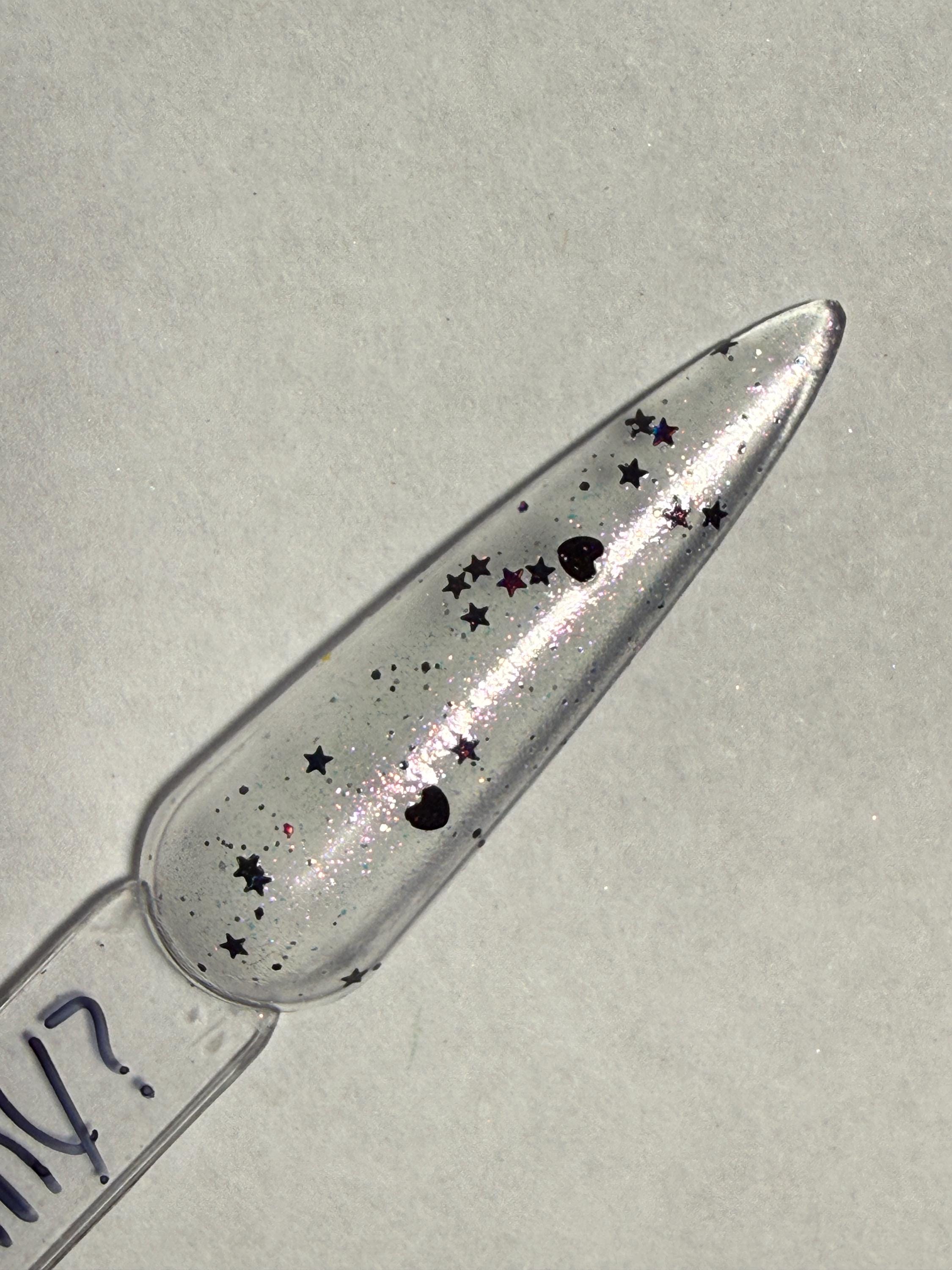 This nail polish comes in either 5 or 15ml bottles and has a shimmery base with a pink flash along with red holo hearts and stars and a touch of holo glitter.