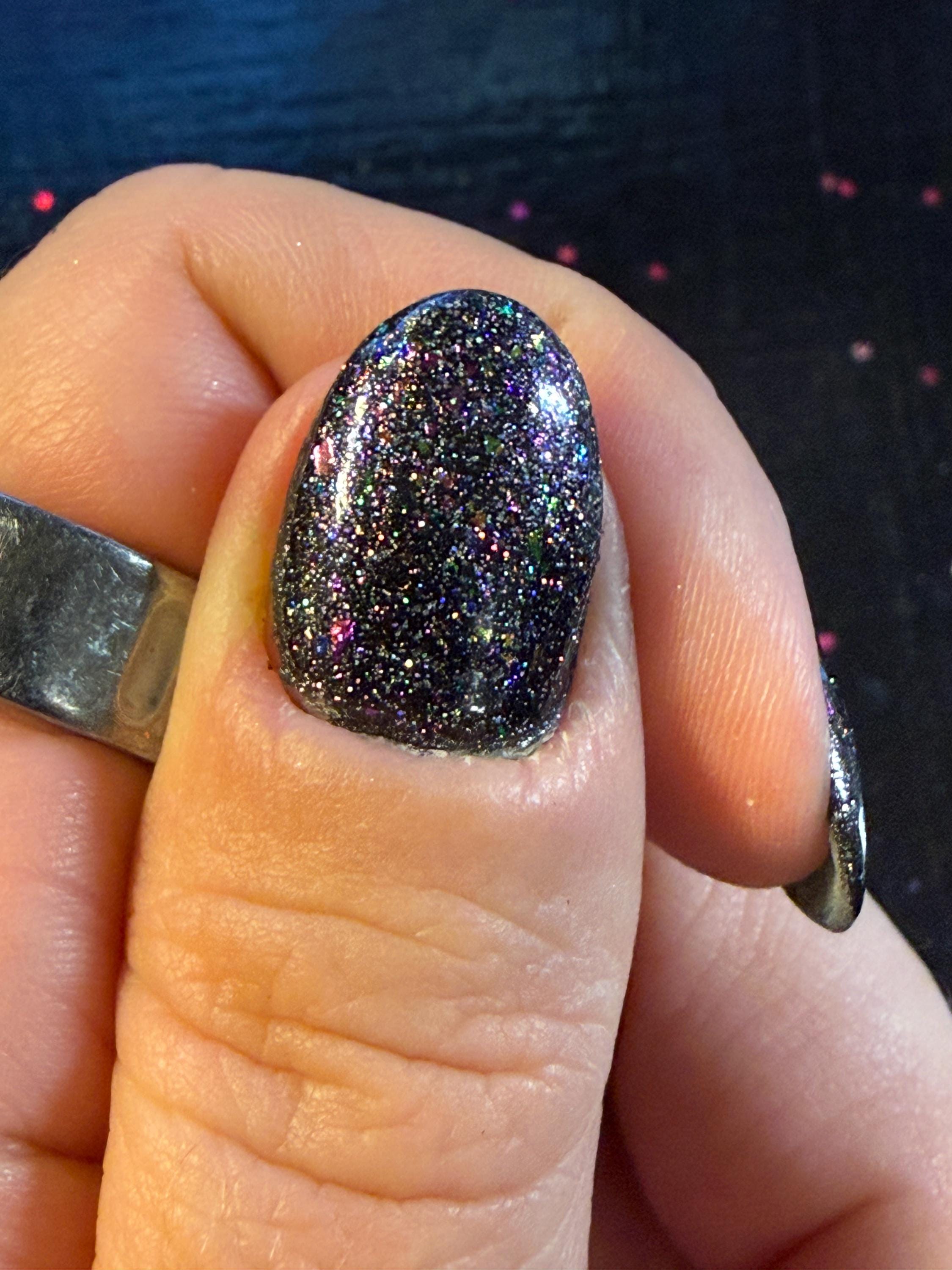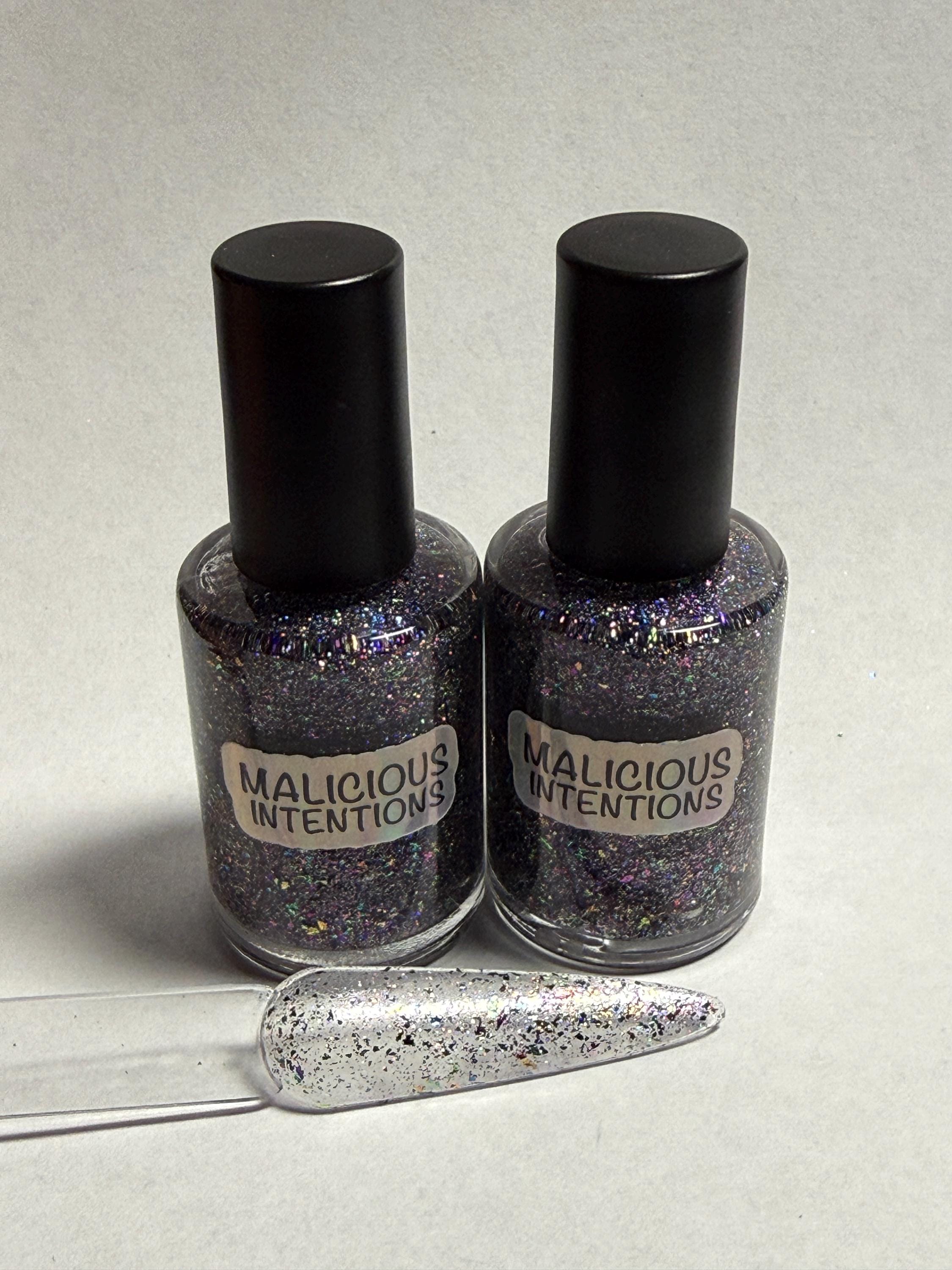 This nail polish comes in either 5 or 15ml bottles and has 12 different types of chameleon flakes as well as both silver and dark gray ultra fine holo glitter mixed in - a true party. We're all waiting for the Big Beautiful oBituary and there will be a party for sure.