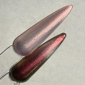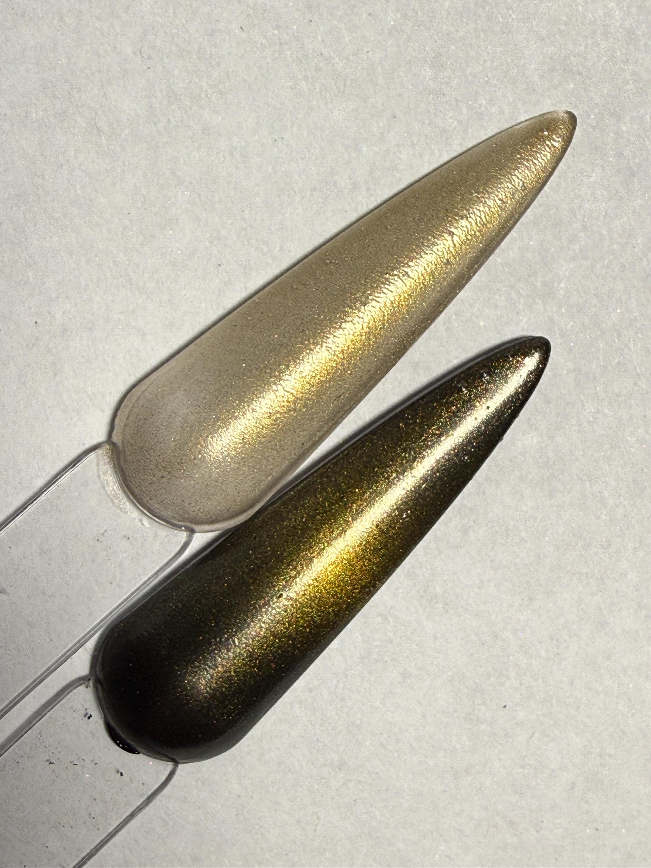 The photos/videos is one coat over a black base and magnetized using the bead method, and the other is two coats on clear, velvetized.