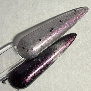 The photos/videos is one coat over a black base and magnetized using the bead method, and the other is two coats on clear, velvetized.