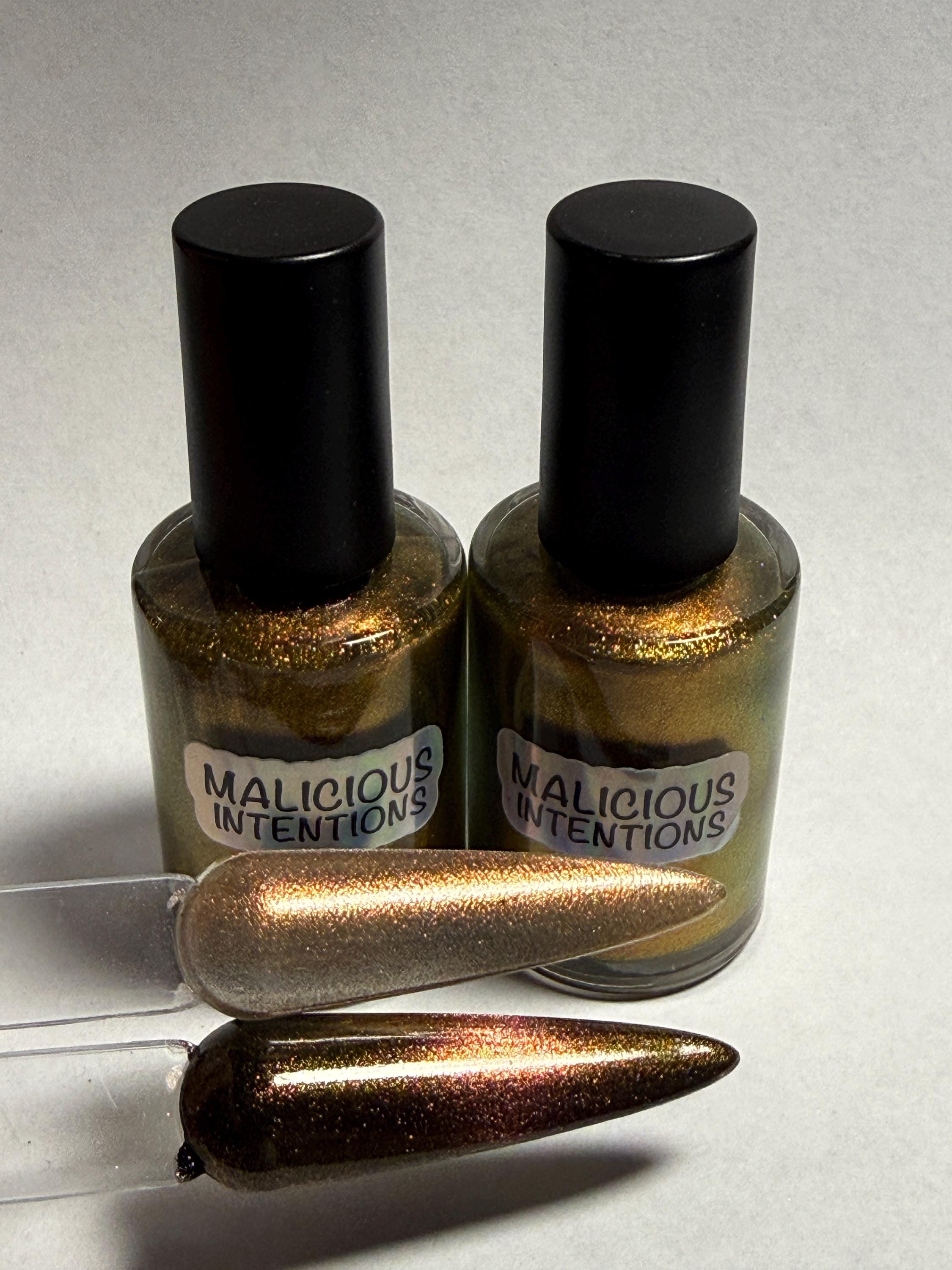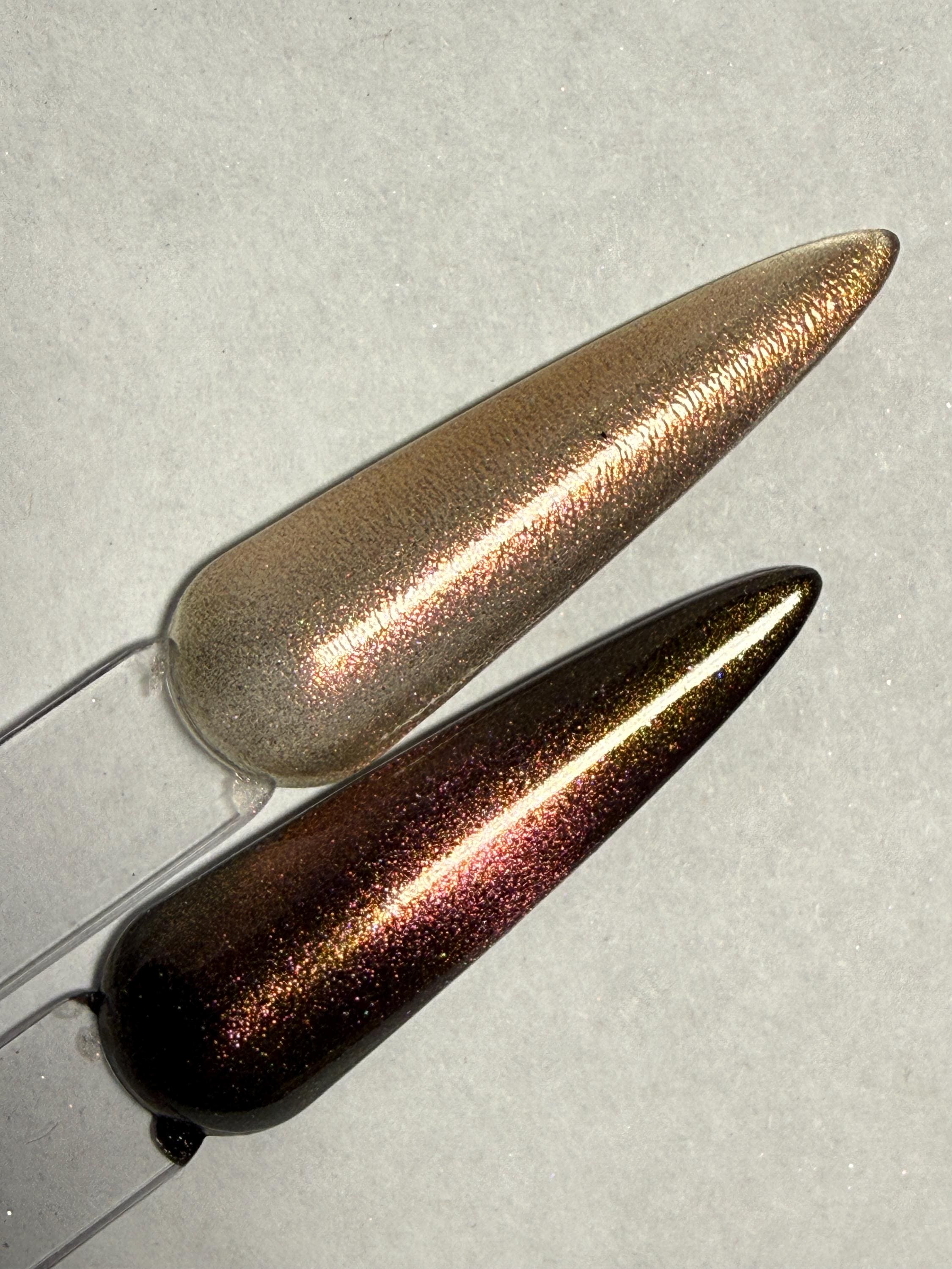 This polish comes in either 5ml or 15ml bottles and has a slightly golden base with fine particle magnetics that shift pink, orange, and yellow with a touch of gold holo.