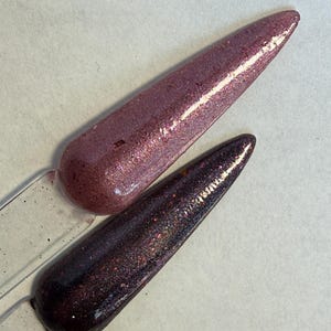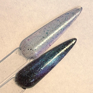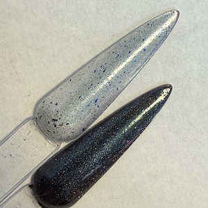 The photos/videos is one coat over a black base and magnetized using the bead method, and the other is two coats on clear, velvetized.