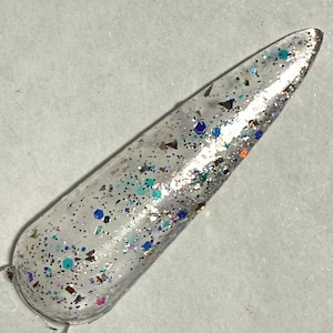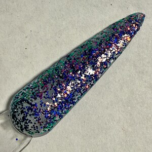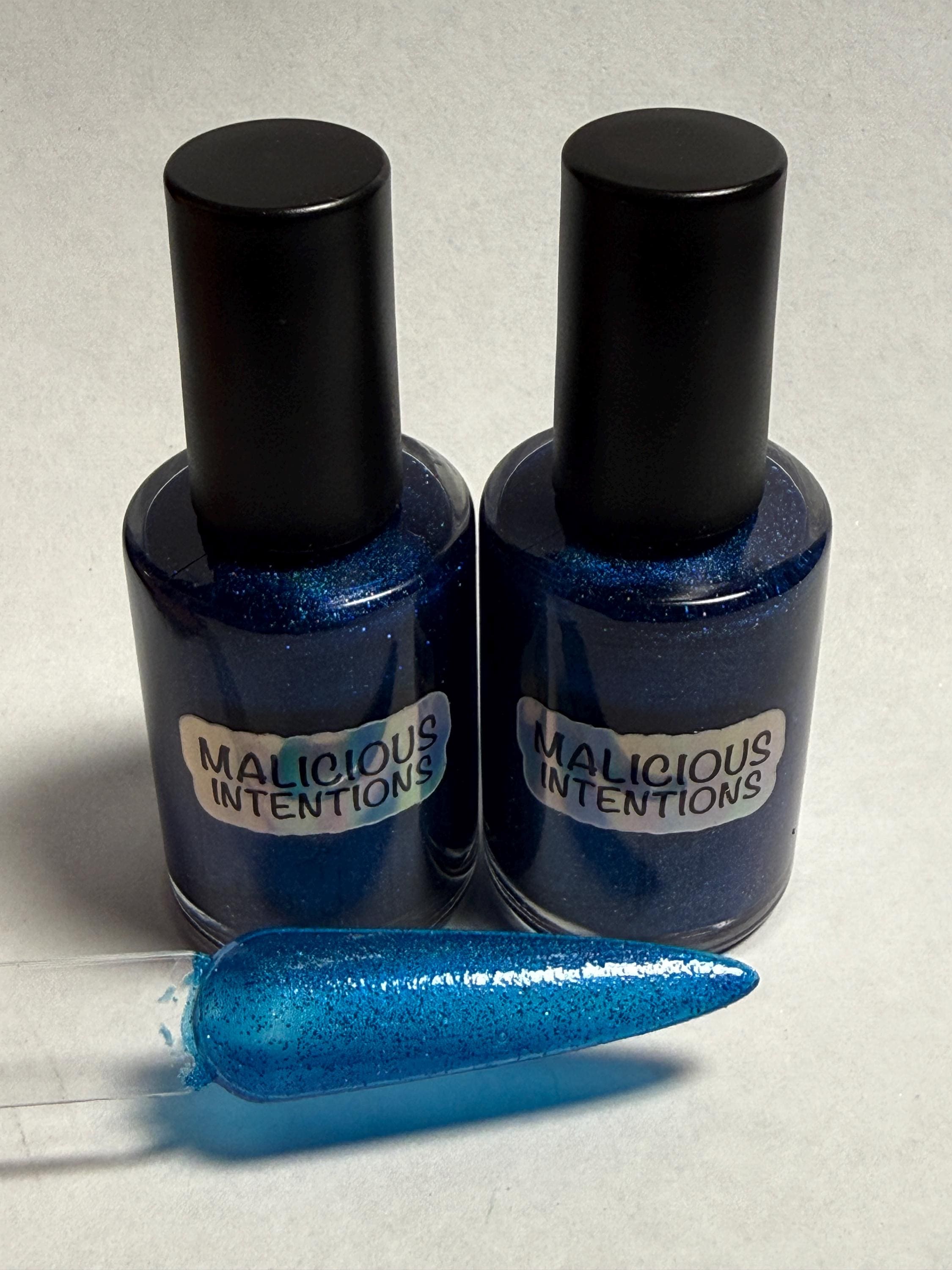 This nail polish comes in either 5 or 15ml bottles and has a blue crelly base with very finely milled blue holographic pigment and some blue reflective bits.