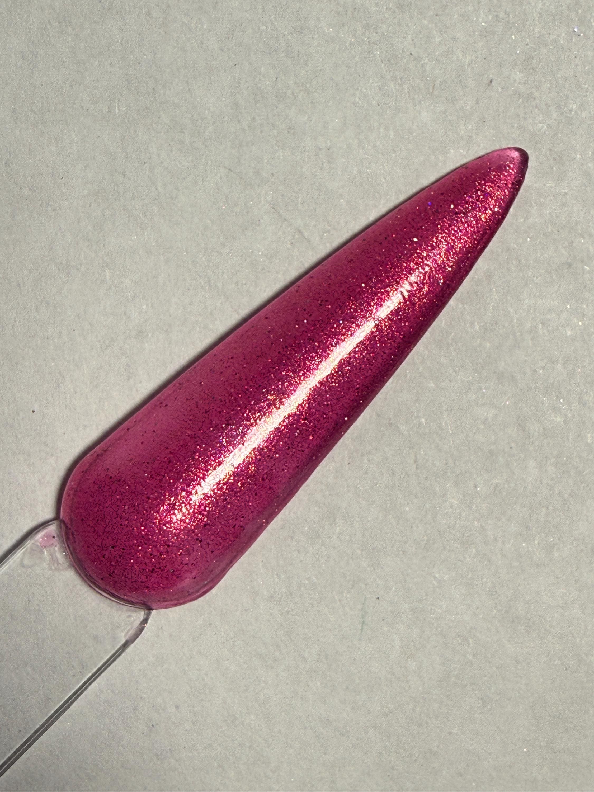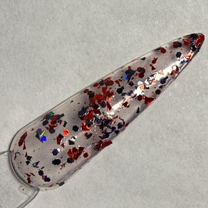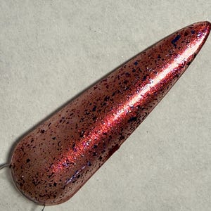 This nail polish comes in either 5 or 15ml bottles and has a deep red base with a gold flash and a tiny bit of ultra fine holo mixed in.