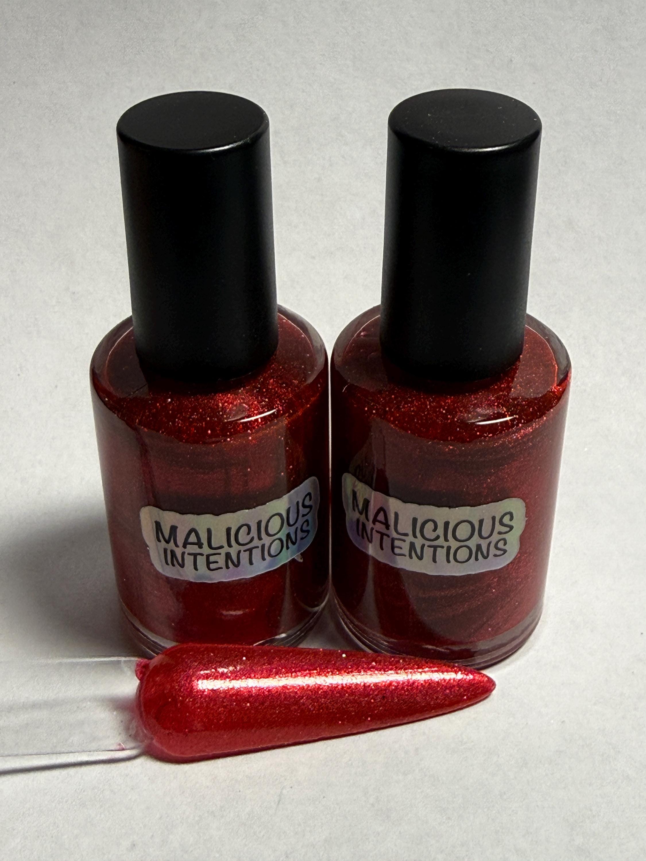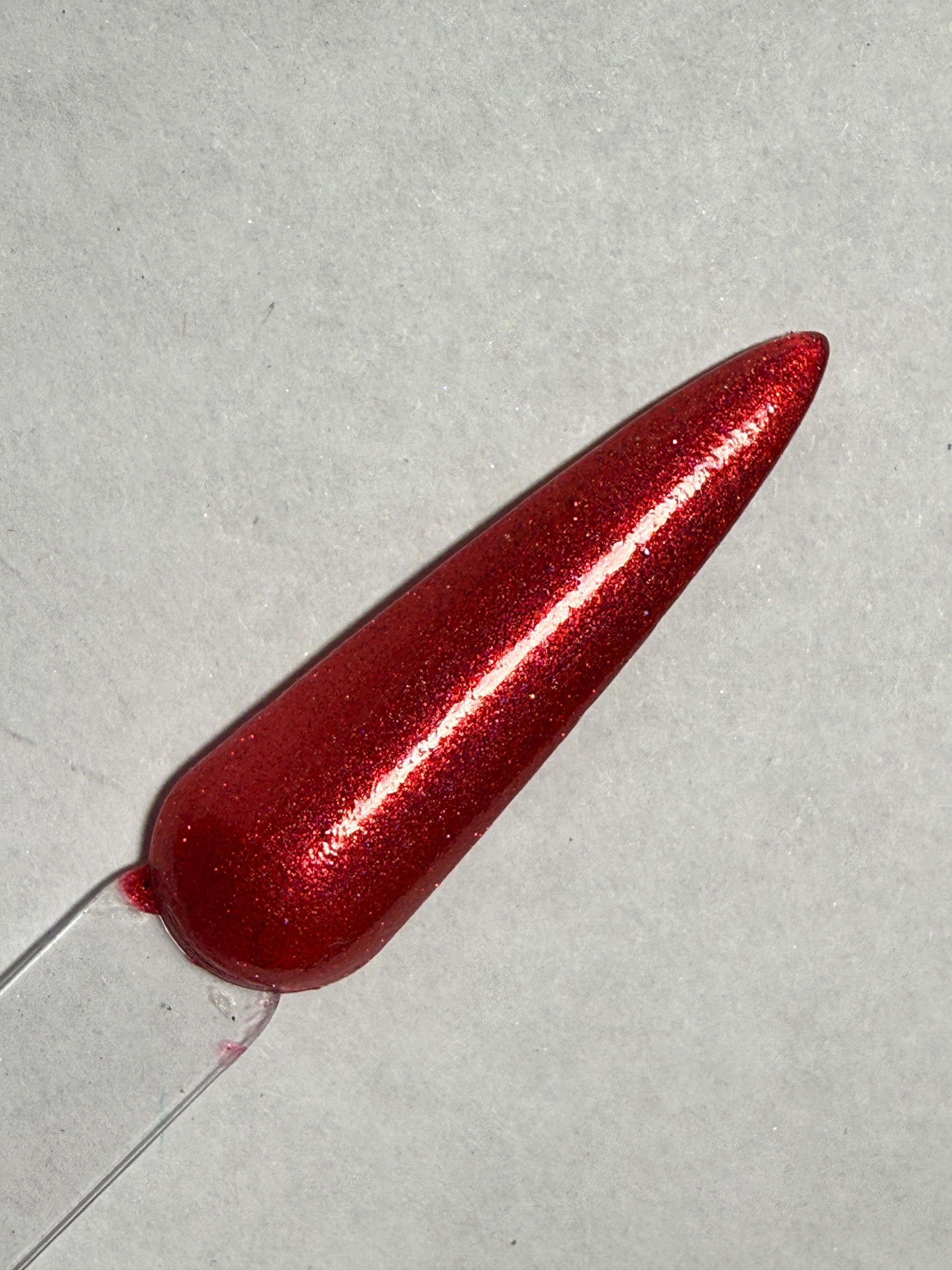 This nail polish comes in either 5 or 15ml bottles and has a red crelly base with very finely milled red holographic pigment and some red reflective bits.