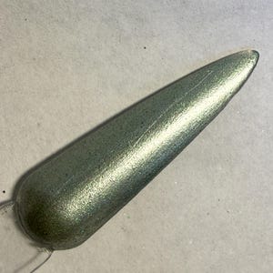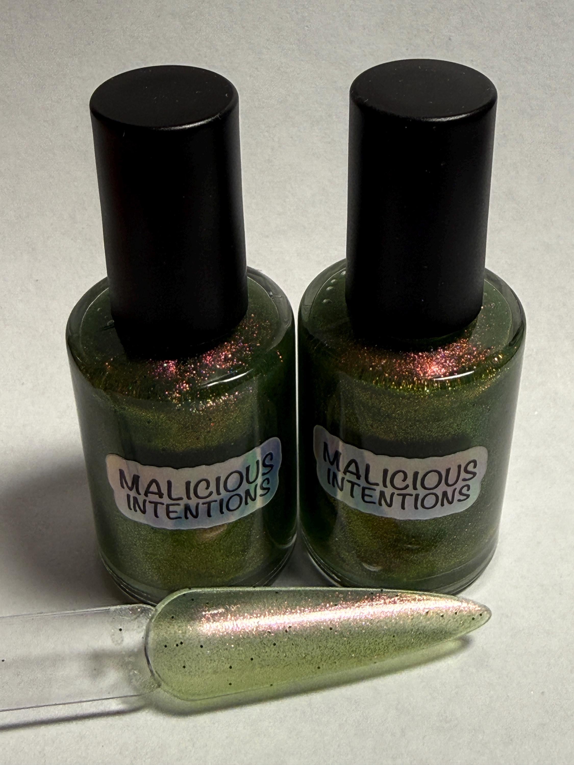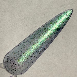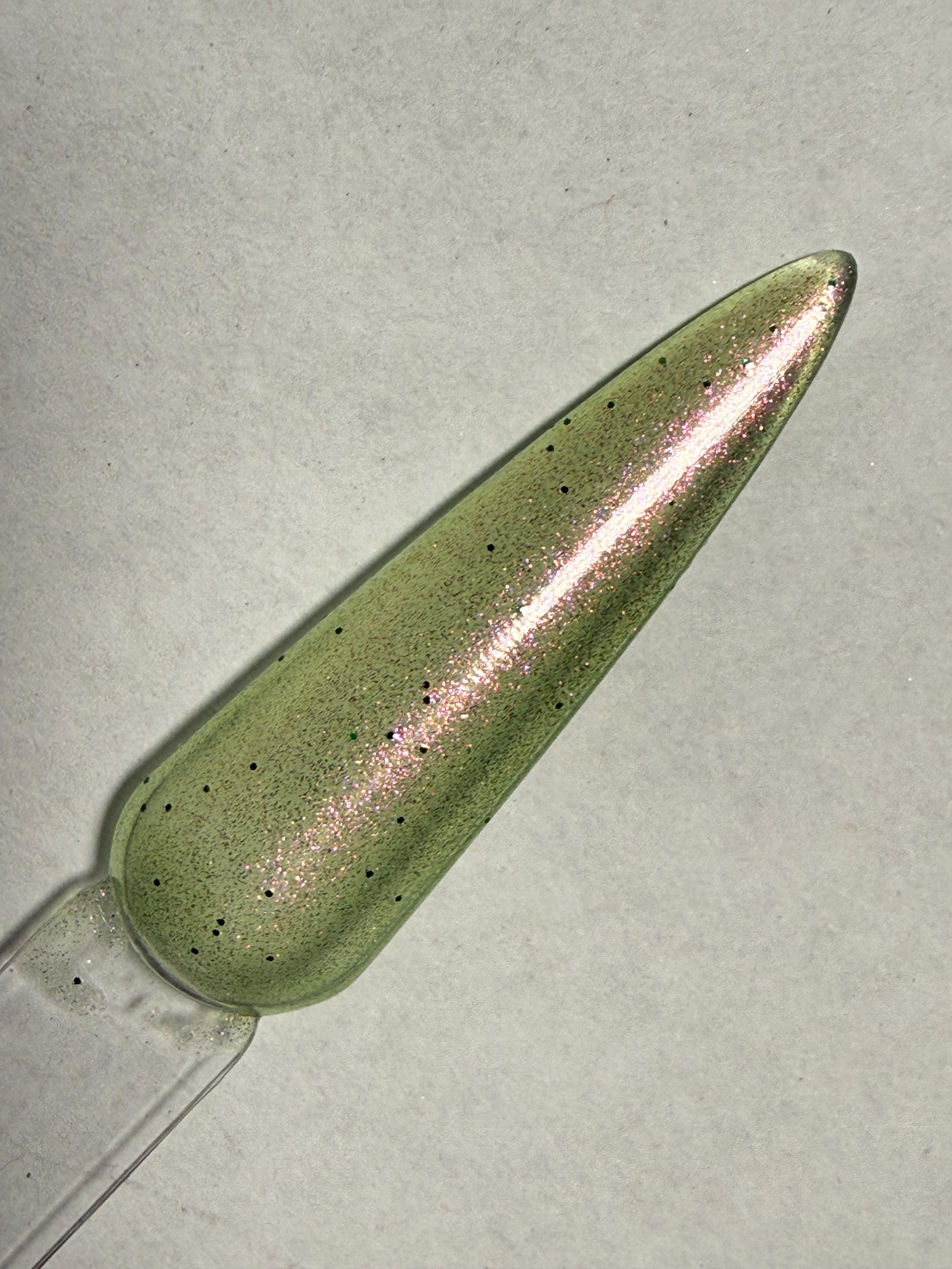 This nail polish comes in either 5 or 15ml bottles and is a green chameleon that shifts pink, orange, and gold, with tiny green holo specks of glitter.