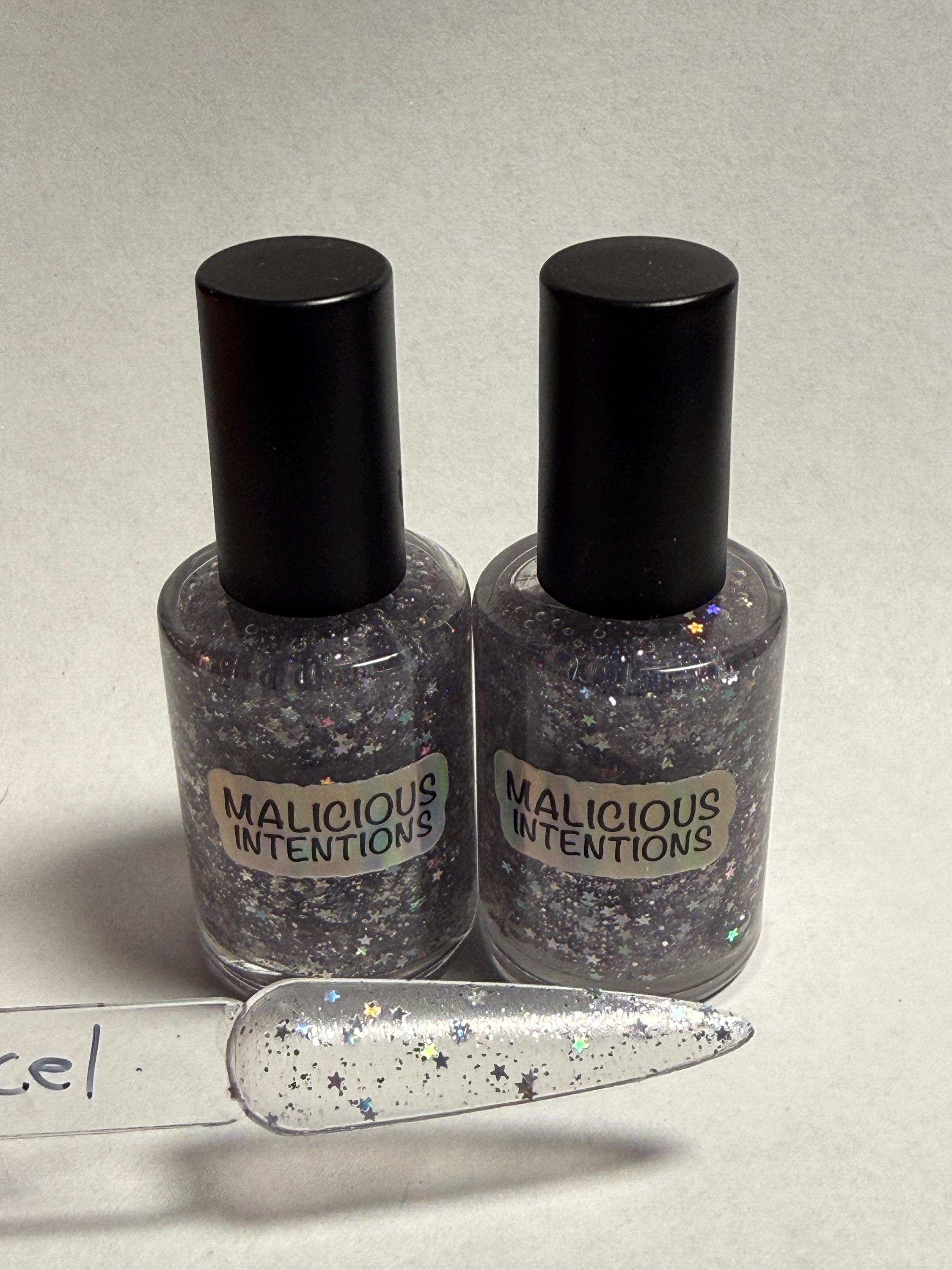 This nail polish comes in either 5 or 15ml bottles and has tiny silver platinum flakes and silver 1mm stars.