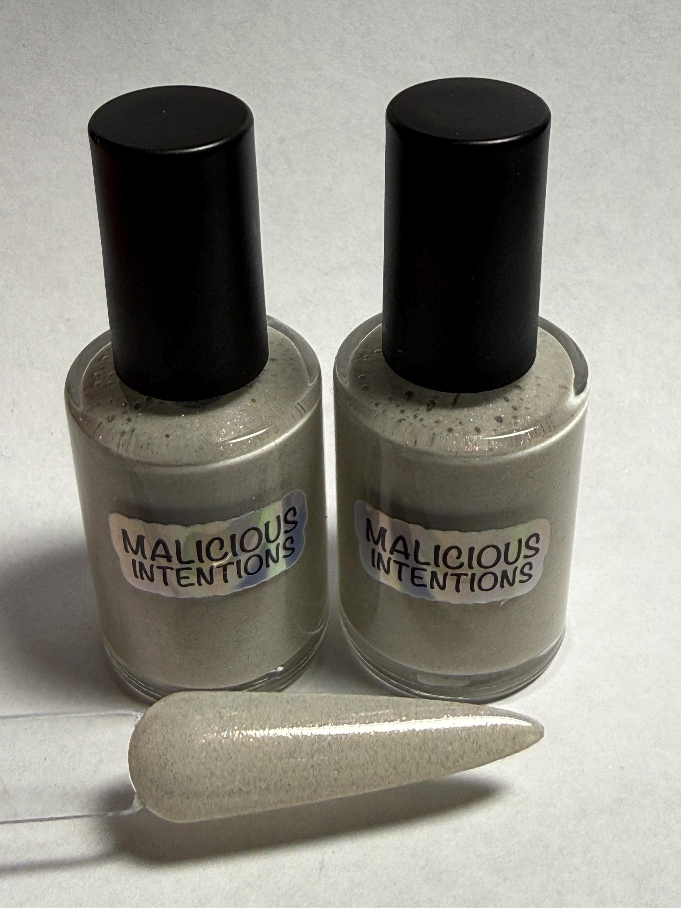 This nail polish comes in either 5 or 15ml bottles and is tough to describe. It starts off with an off white base with a gold flash and then is topped with some dark gold holographic powder.