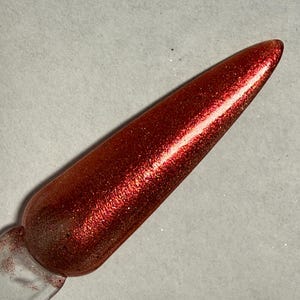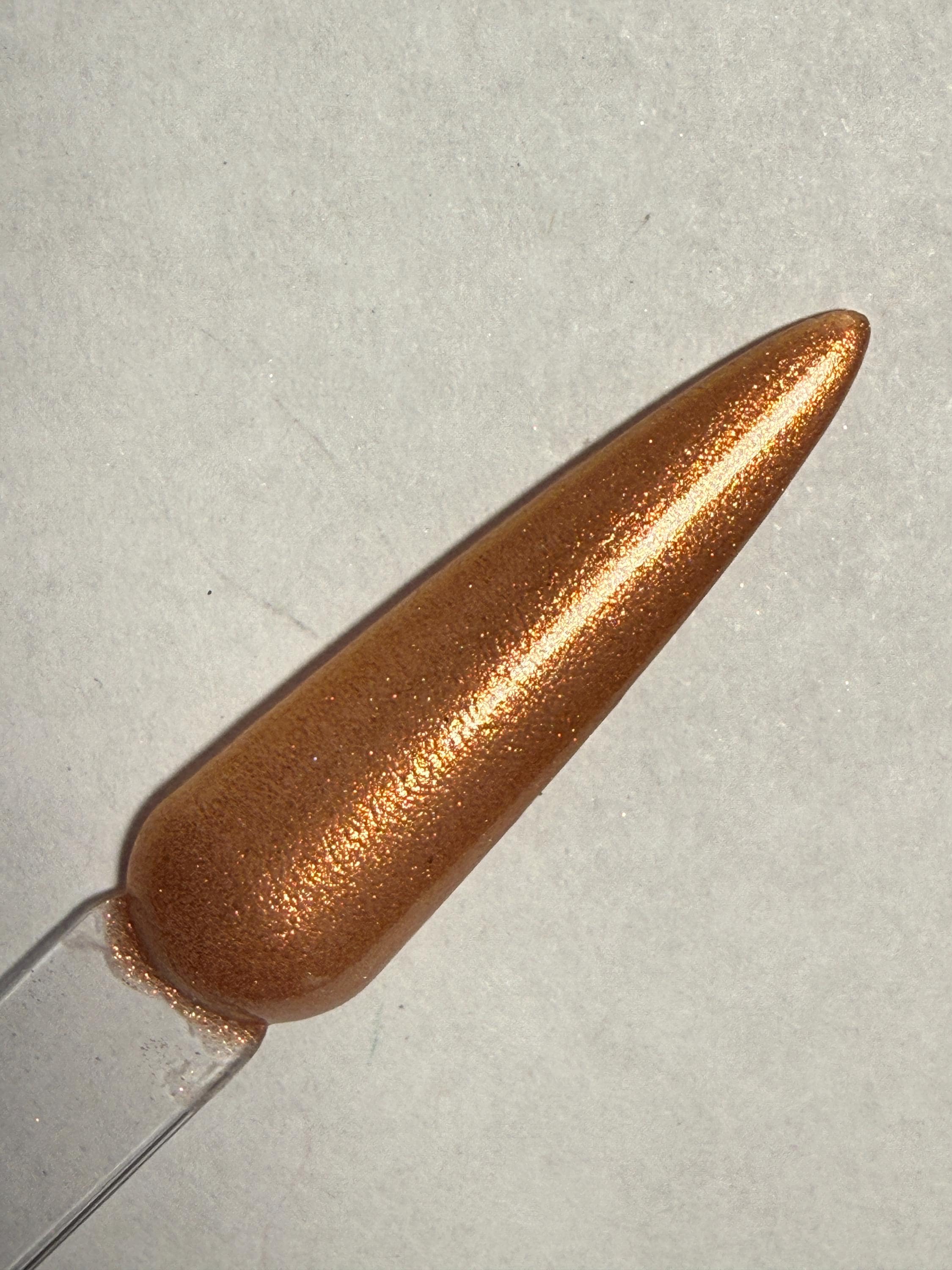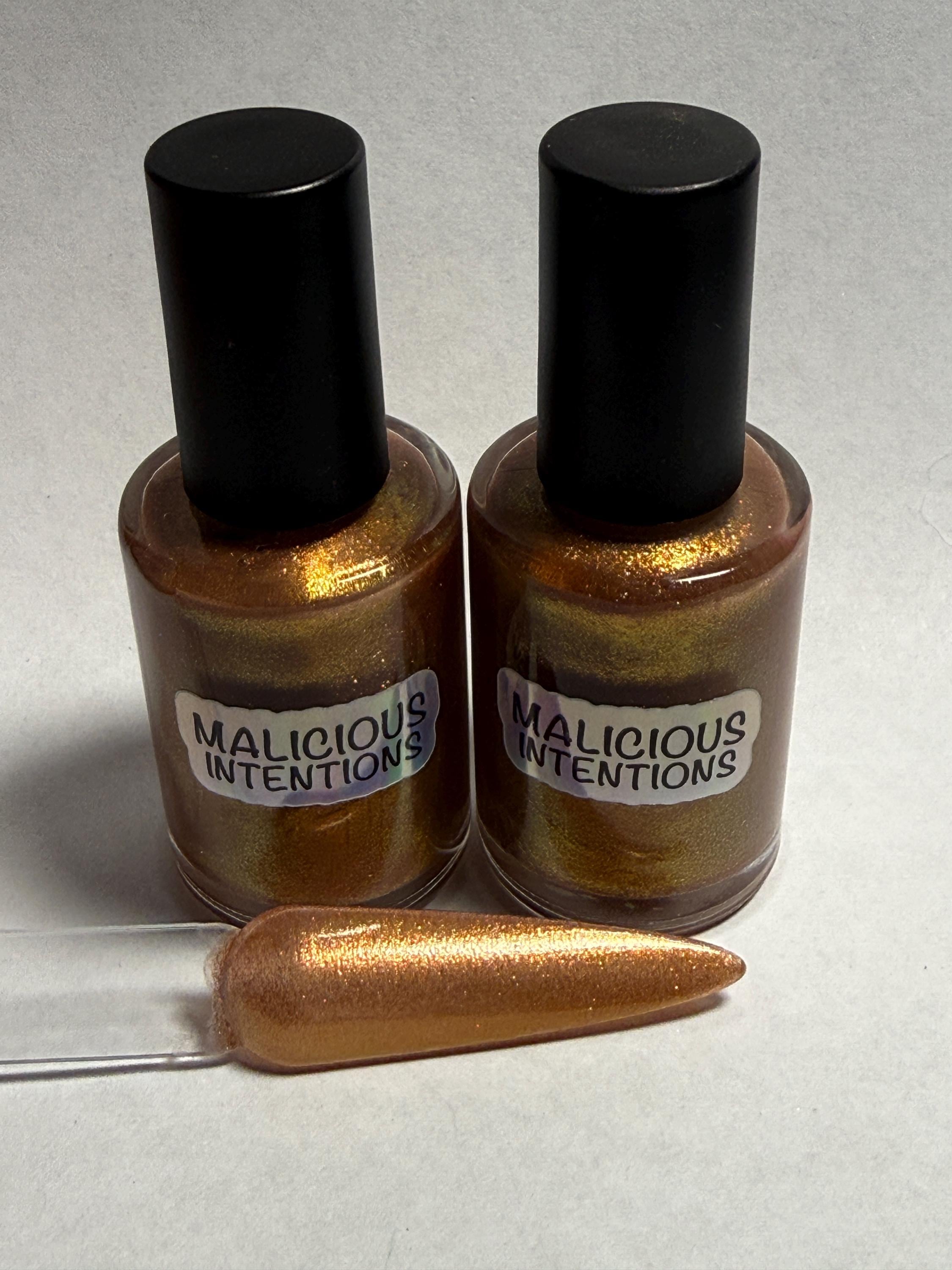 This nail polish comes in either 5 or 15ml bottles and has a white base and gold duochrome pigment that shifts orange and pink along with a touch of dark gold holographic powder.