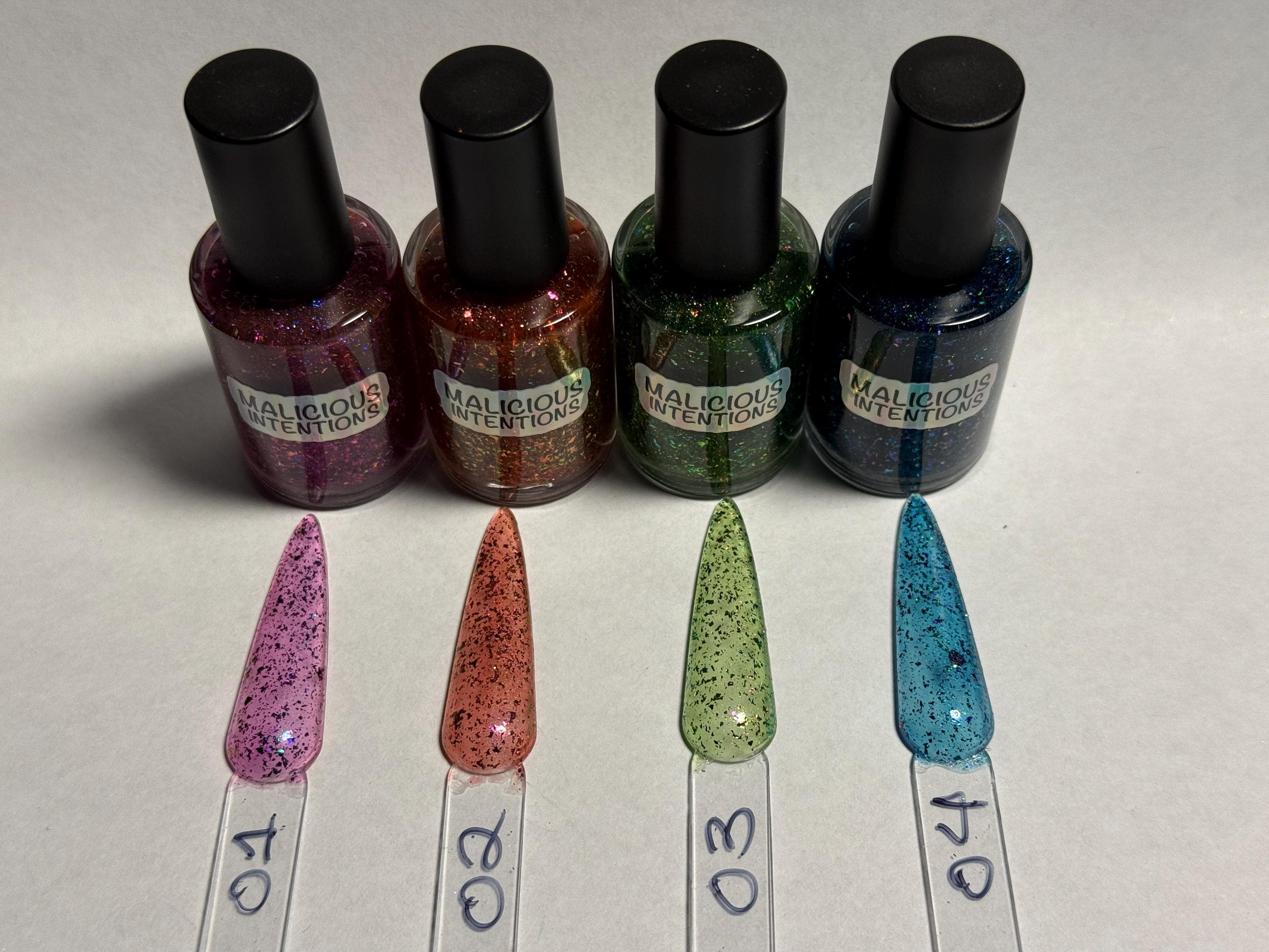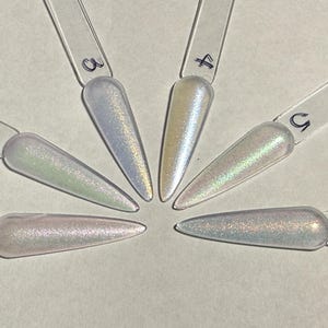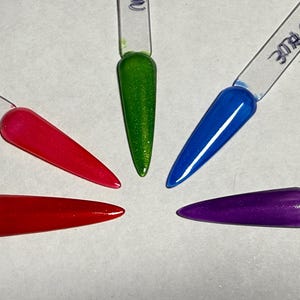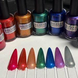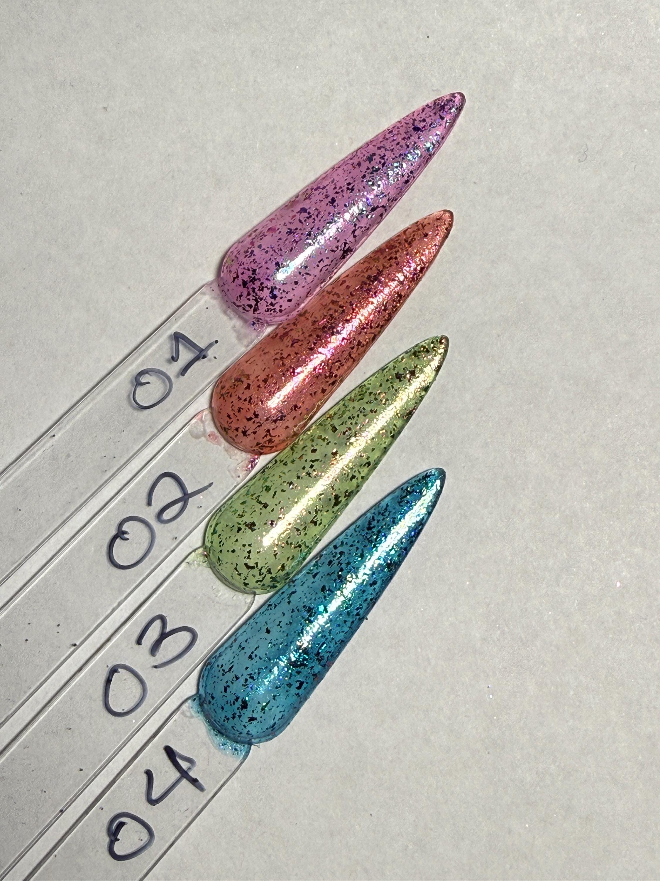 This series has a very fine holographic base in one of four colors, hot pink, orange, green, and blue, with three different colors of chameleon flakes that each contain a shift that matches the base. Absolutely gorgeous!