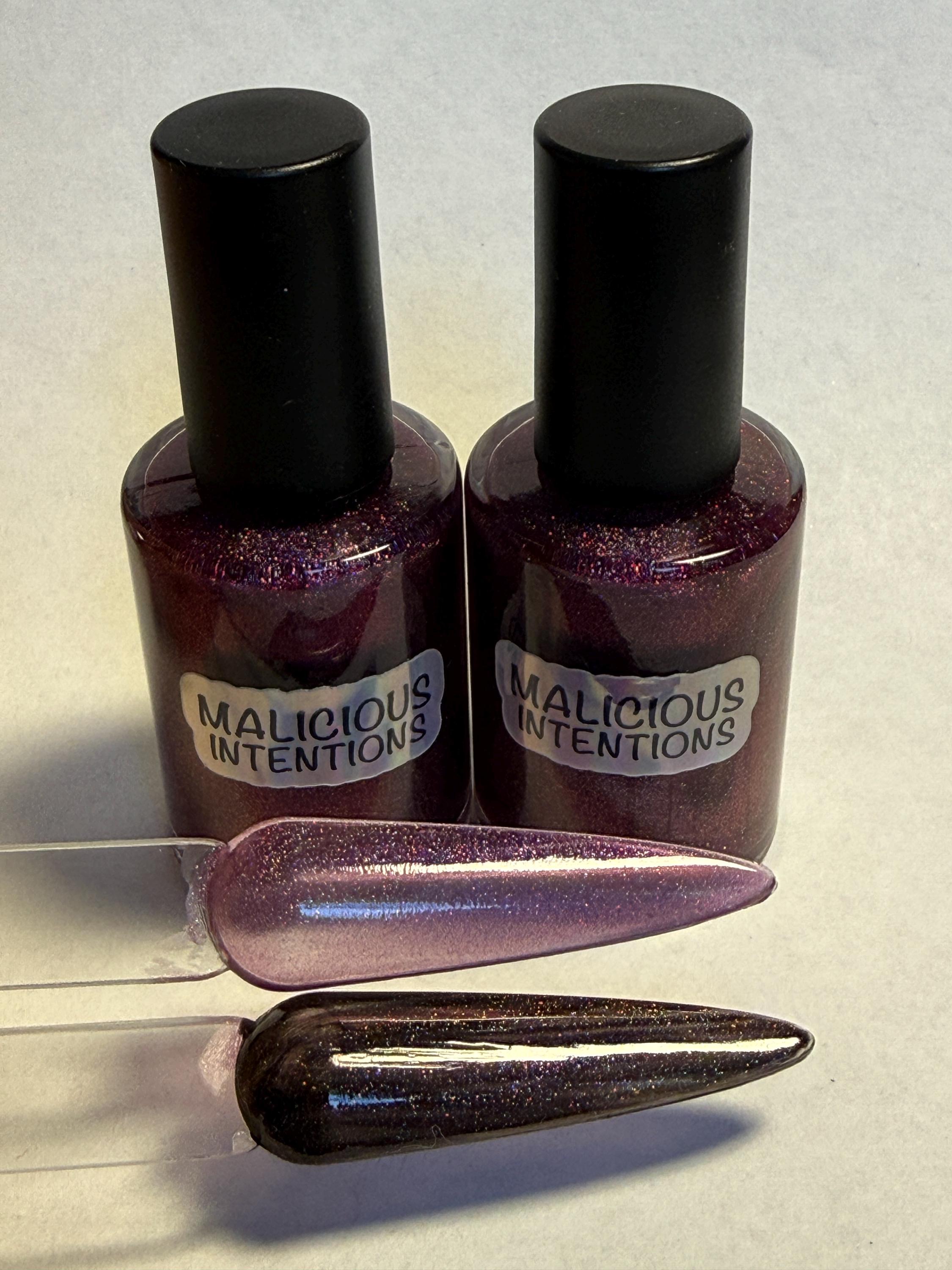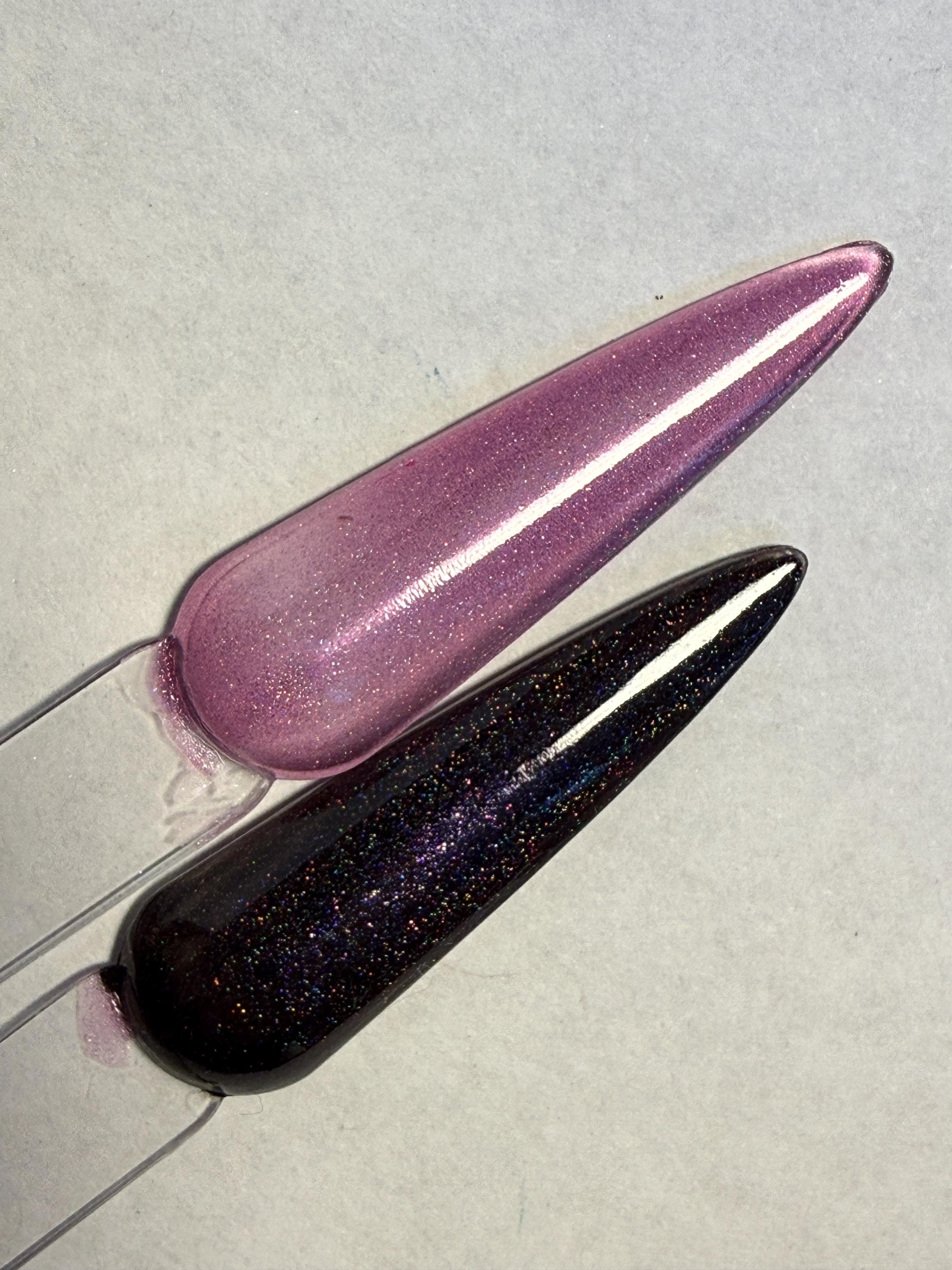 This polish comes in either 5ml or 15ml bottles and has a berry pink jelly base and silver holographic magnetic particles.