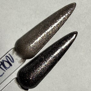 The photos/videos is one coat over a black base and magnetized using the bead method, and the other is two coats on clear, velvetized.
