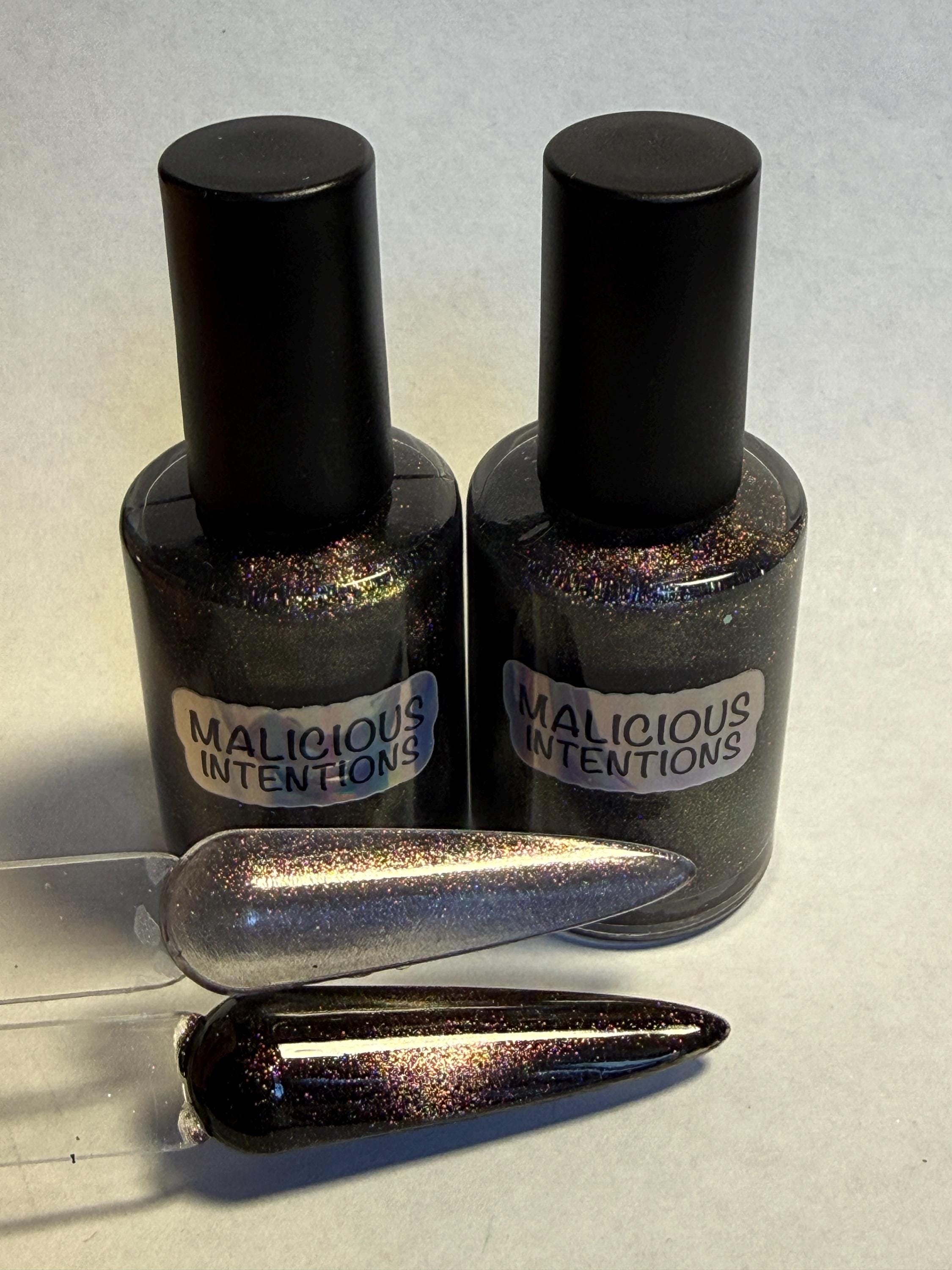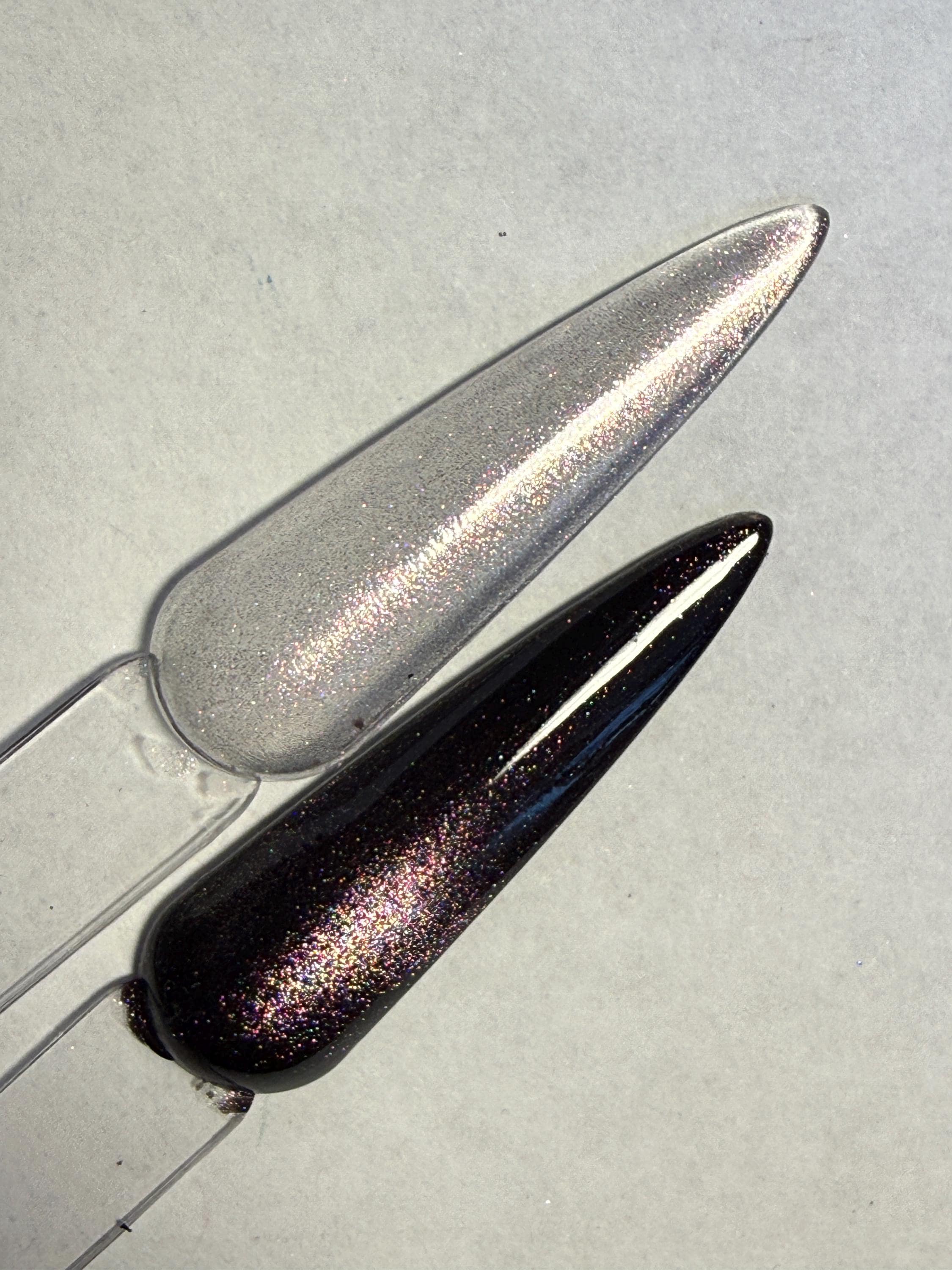 This polish comes in either 5ml or 15ml bottles and this is what happens when you mix all your chameleon magnetic powders together in equal parts. From a distance it looks silver, but up close you can actually see the individual colored particles for a mosaic effect.