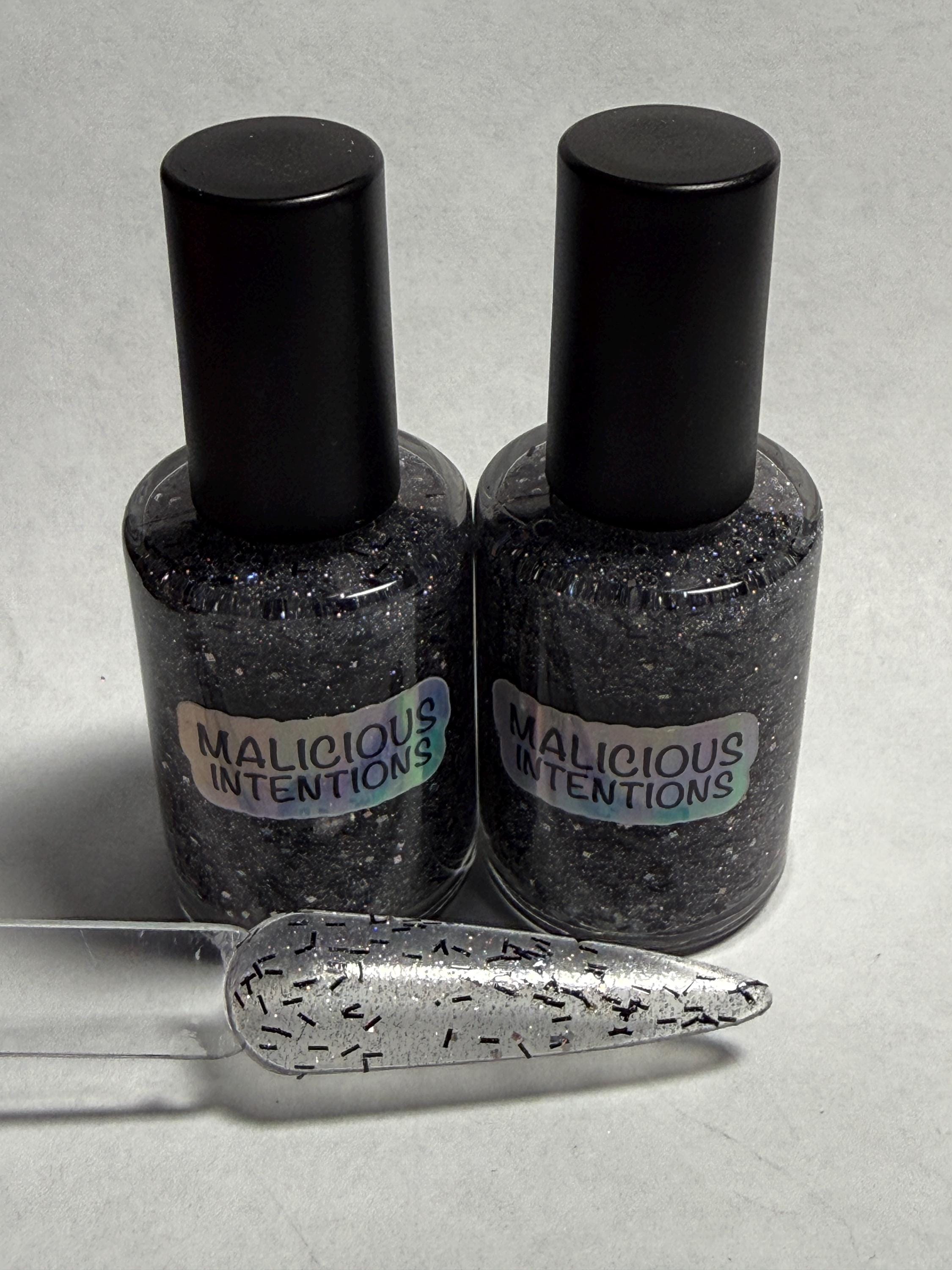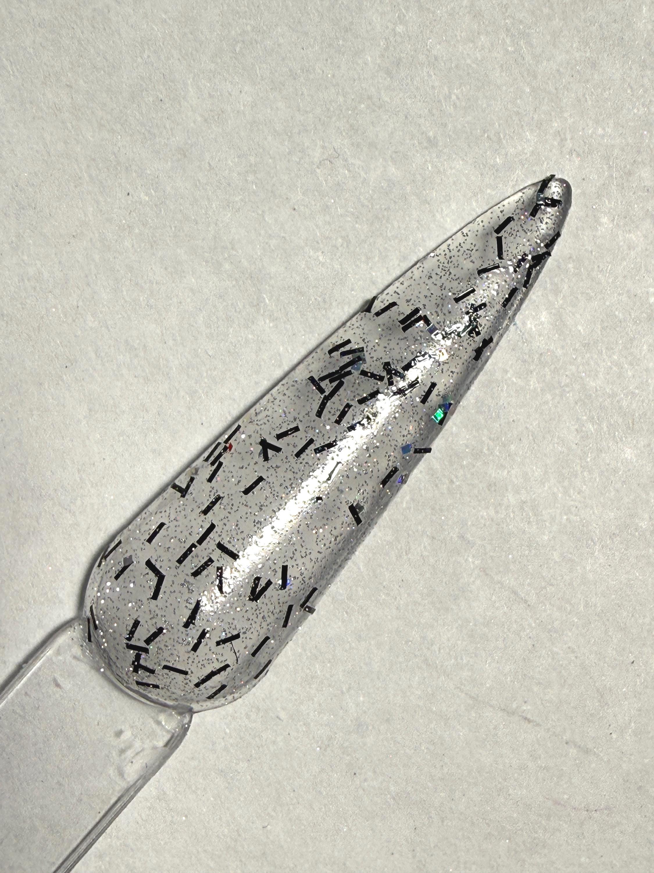 This nail polish comes in either 5 or 15ml bottles and has black tinsel glitter, fine holographic glitter, the occasional silver holographic square, and silver reflects. Use alone or as a topper.