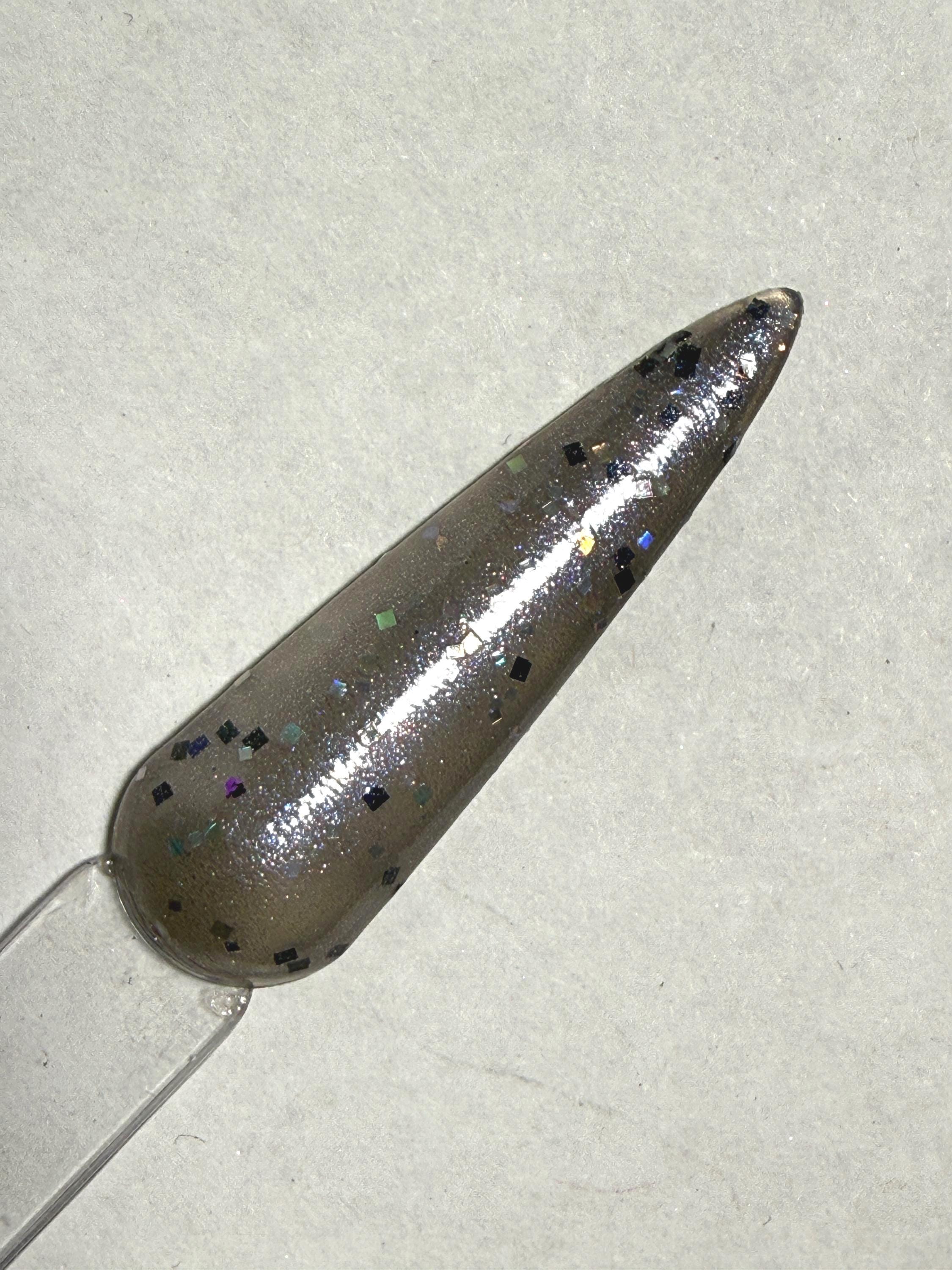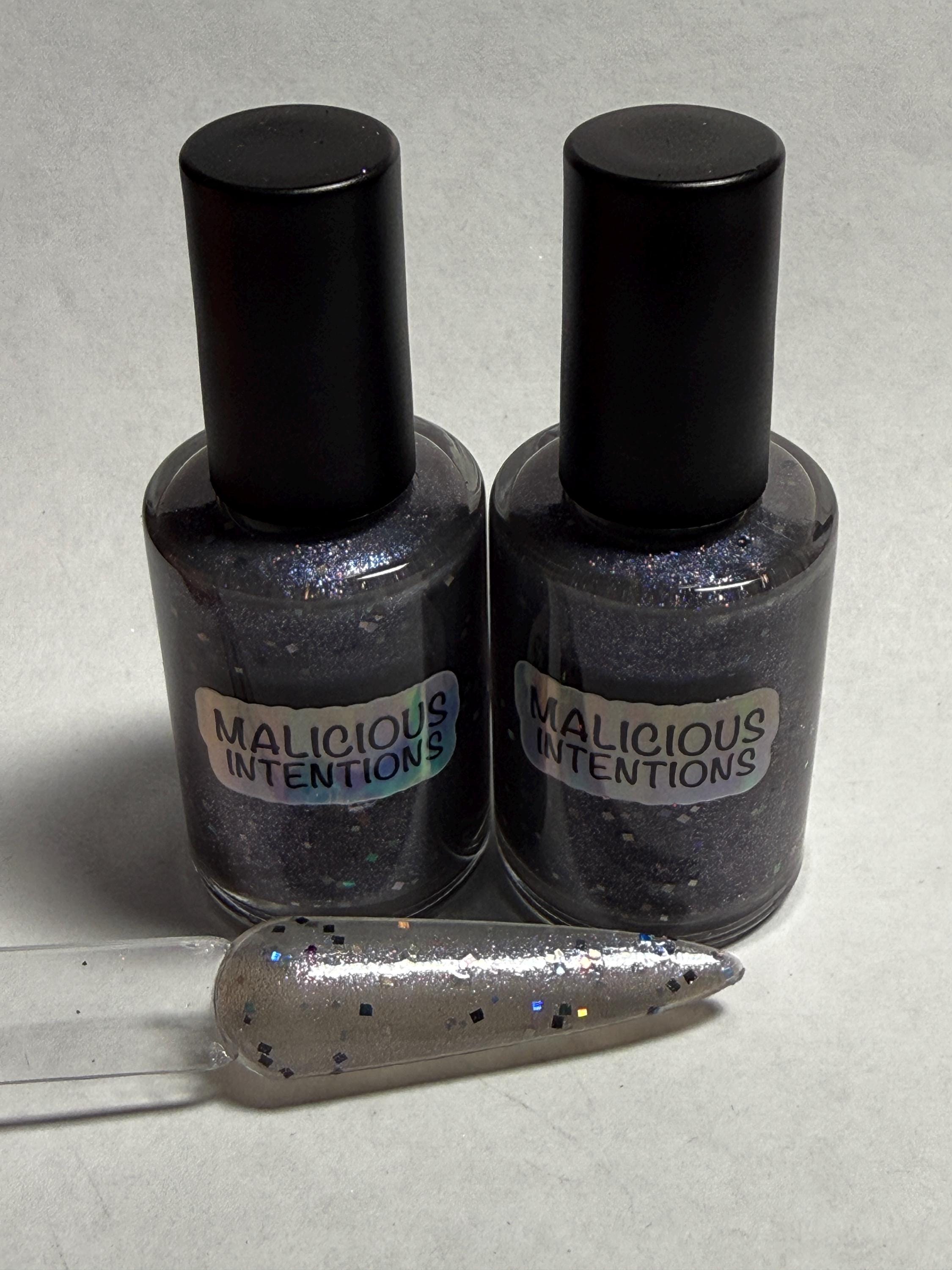 This nail polish comes in either 5 or 15ml bottles and has a shimmery gray base with black, silver, and iridescent holographic squares.