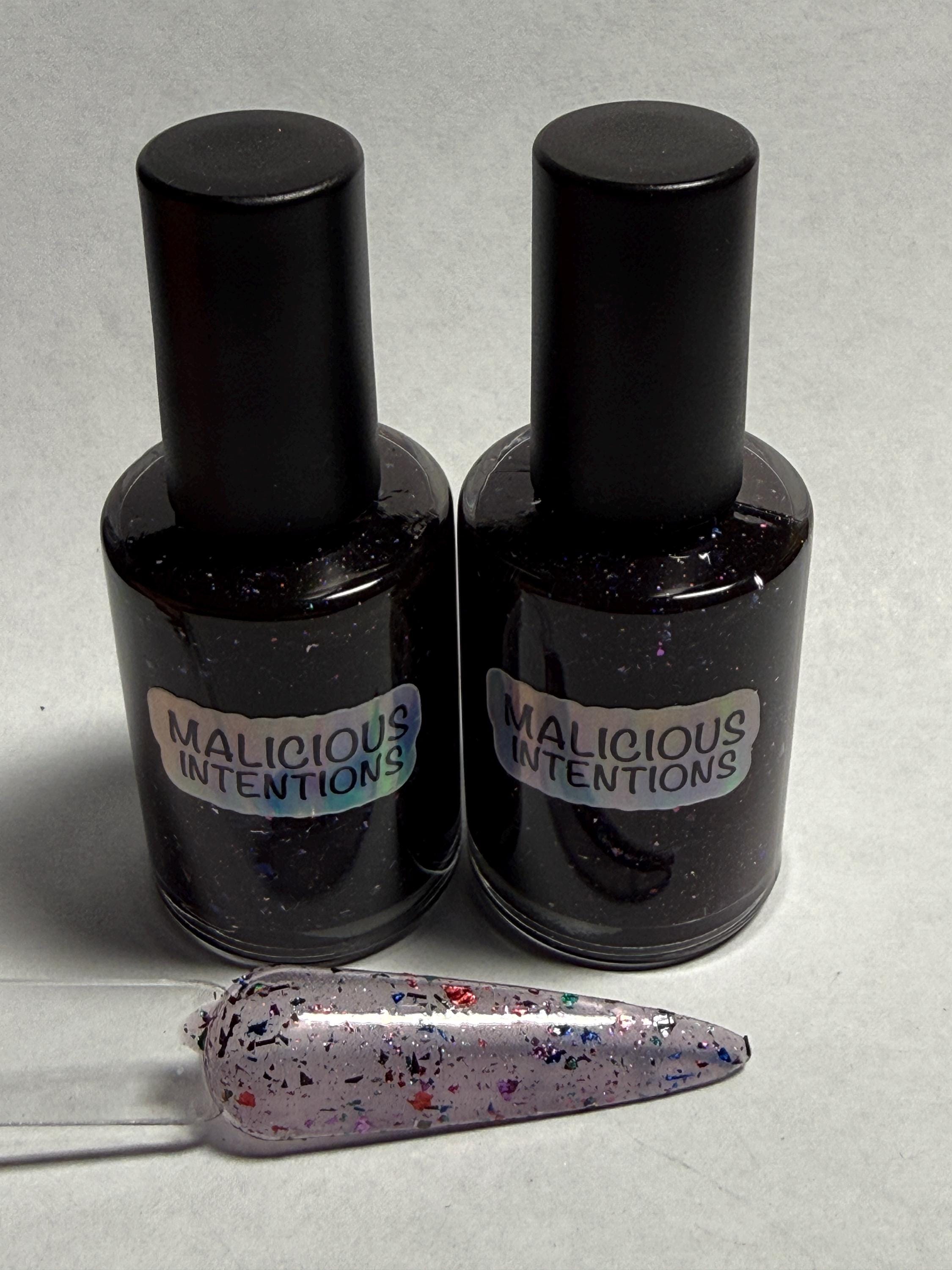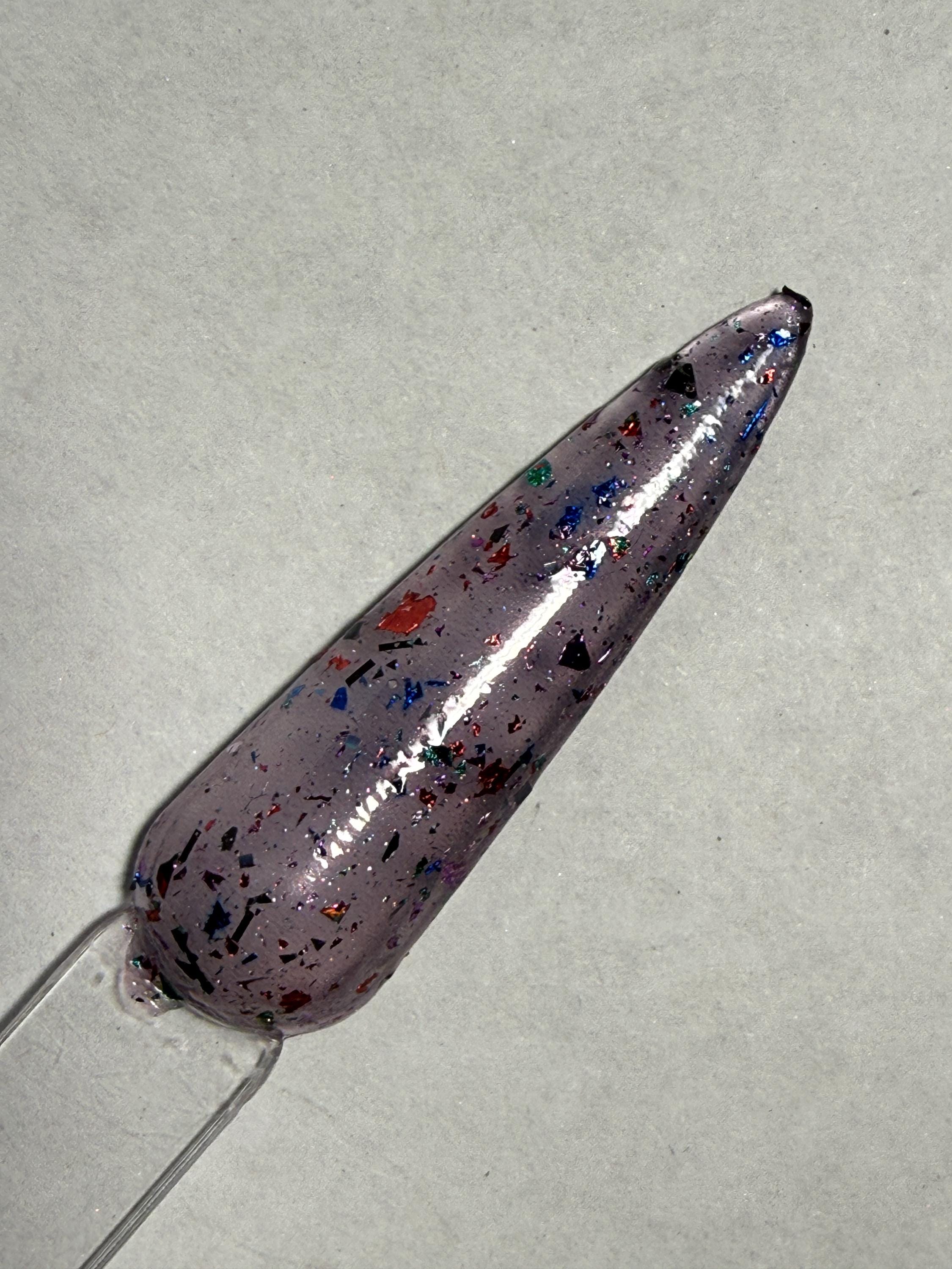 This nail polish comes in either 5 or 15ml bottles and is loaded with red, green, blue, black, and purple flakes in a purple jelly base.